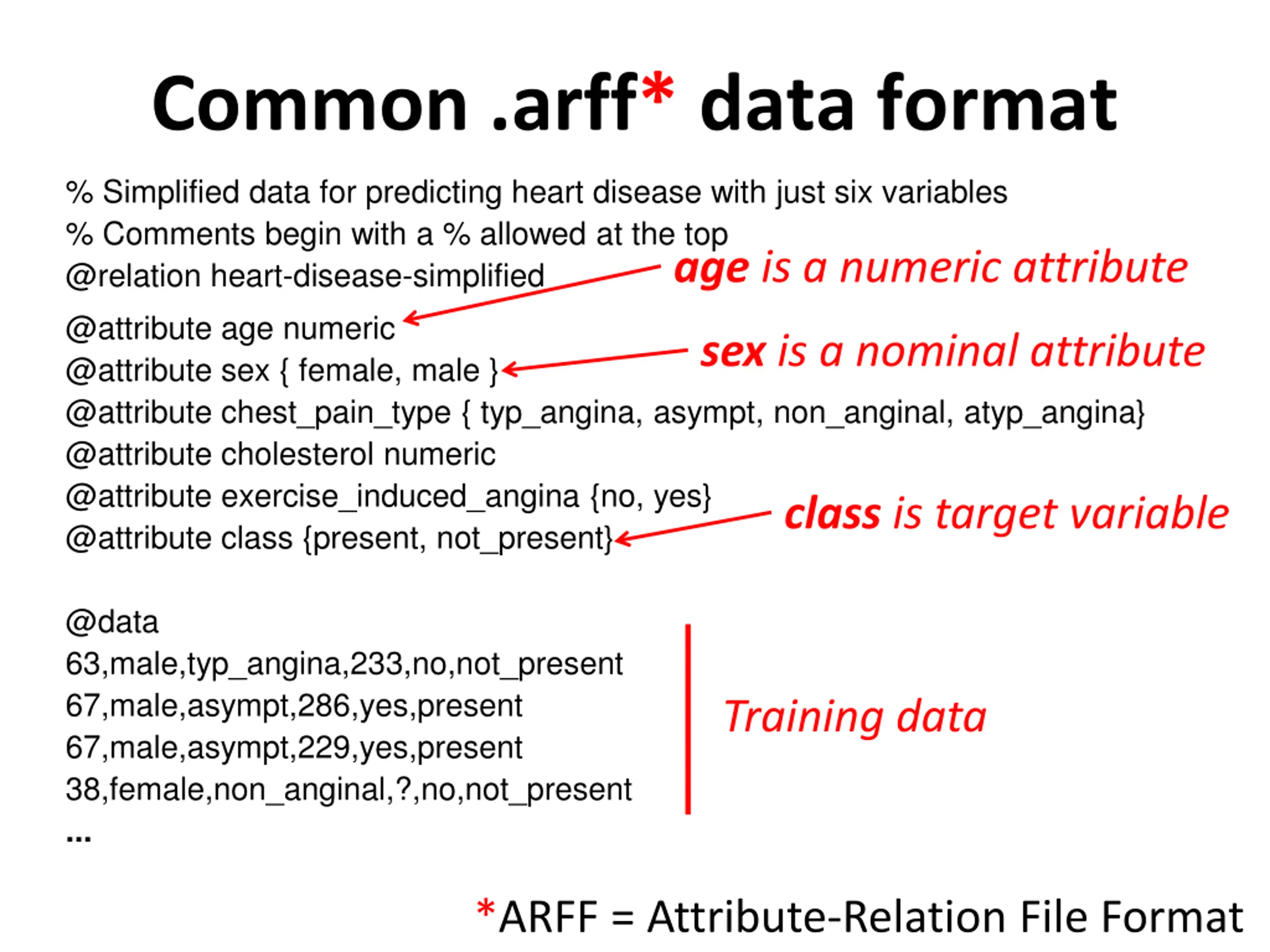 Common .arff* data format % Simplified data for predicting heart disease with just six variables % Comments begin with a % allowed at the top @relation heart-disease-simplified @attribute age numeric @attribute sex { female, male } @attribute chest_pain_type { typ_angina, asympt, non_anginal, atyp_angina} @attribute cholesterol numeric @attribute exercise_induced_angina {no, yes} @attribute class {present, not_present} age is a numeric attribute sex is a nominal attribute class is target variable @data 63,male,typ_angina,233,no,not_present 67,male,asympt,286,yes,present 67,male,asympt,229,yes,present 38,female,non_anginal,?,no,not_present ... Training data *ARFF = Attribute-Relation File Format