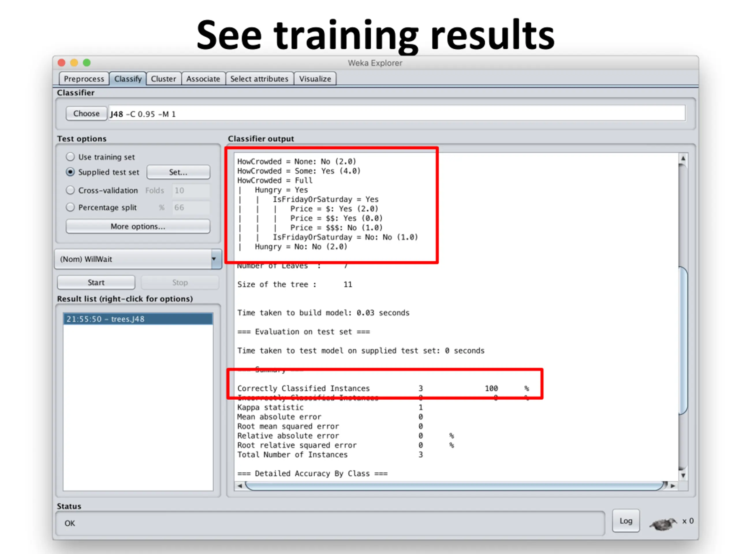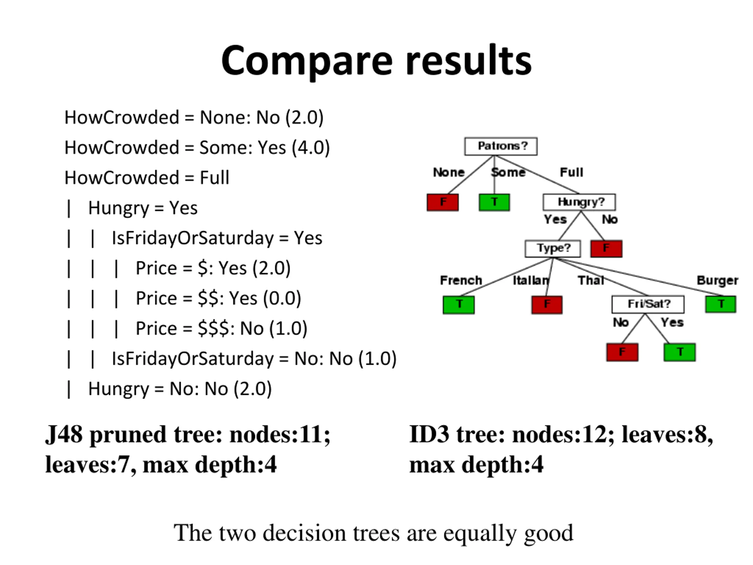 Compare results HowCrowded = None: No (2.0) HowCrowded = Some: Yes (4.0) HowCrowded = Full | Hungry = Yes | | IsFridayOrSaturday = Yes | | | Price = $: Yes (2.0) | | | Price = $$: Yes (0.0) | | | Price = $$$: No (1.0) | | IsFridayOrSaturday = No: No (1.0) | Hungry = No: No (2.0) J48 pruned tree: nodes:11; leaves:7, max depth:4 ID3 tree: nodes:12; leaves:8, max depth:4 The two decision trees are equally good
