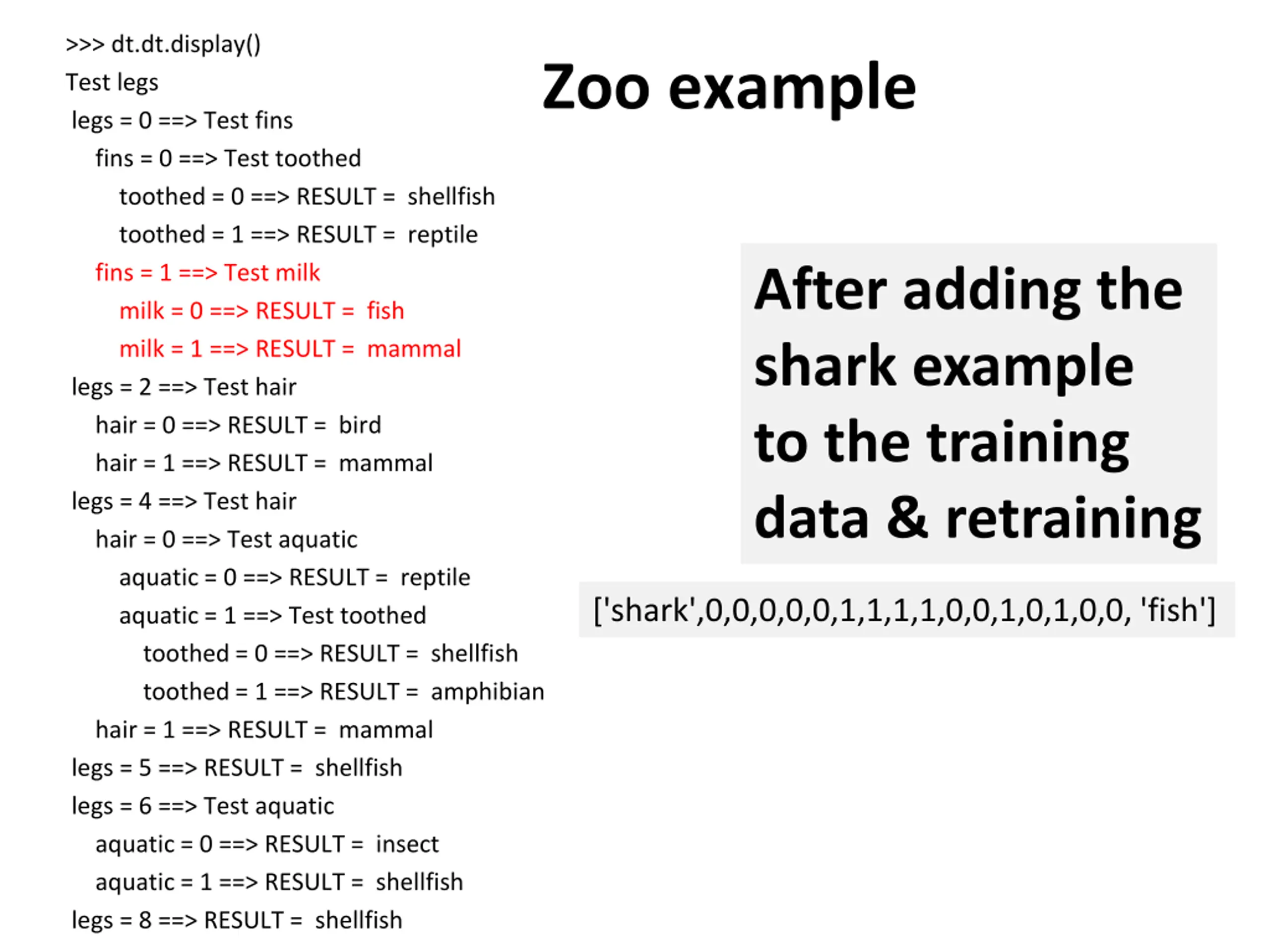 >>> dt.dt.display() Test legs legs = 0 ==> Test fins fins = 0 ==> Test toothed toothed = 0 ==> RESULT = shellfish toothed = 1 ==> RESULT = reptile fins = 1 ==> Test milk milk = 0 ==> RESULT = fish milk = 1 ==> RESULT = mammal legs = 2 ==> Test hair hair = 0 ==> RESULT = bird hair = 1 ==> RESULT = mammal legs = 4 ==> Test hair hair = 0 ==> Test aquatic aquatic = 0 ==> RESULT = reptile aquatic = 1 ==> Test toothed toothed = 0 ==> RESULT = shellfish toothed = 1 ==> RESULT = amphibian hair = 1 ==> RESULT = mammal legs = 5 ==> RESULT = shellfish legs = 6 ==> Test aquatic aquatic = 0 ==> RESULT = insect aquatic = 1 ==> RESULT = shellfish legs = 8 ==> RESULT = shellfish Zoo example After adding the shark example to the training data & retraining ['shark',0,0,0,0,0,1,1,1,1,0,0,1,0,1,0,0, 'fish']