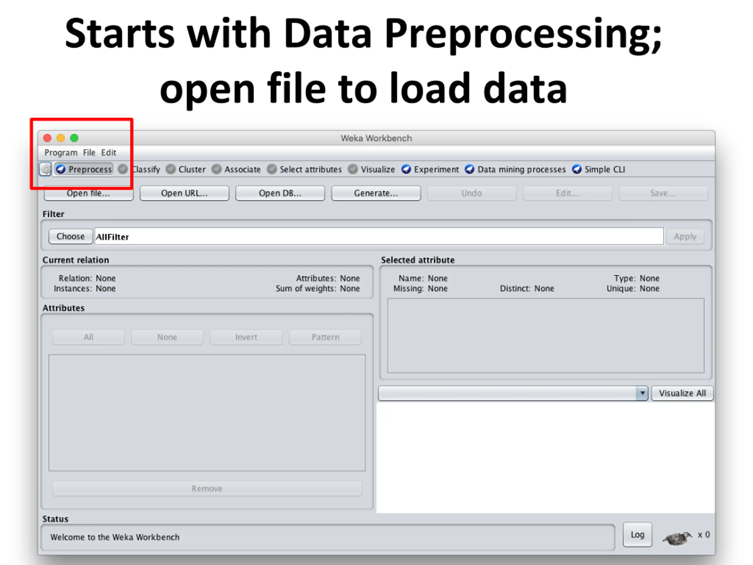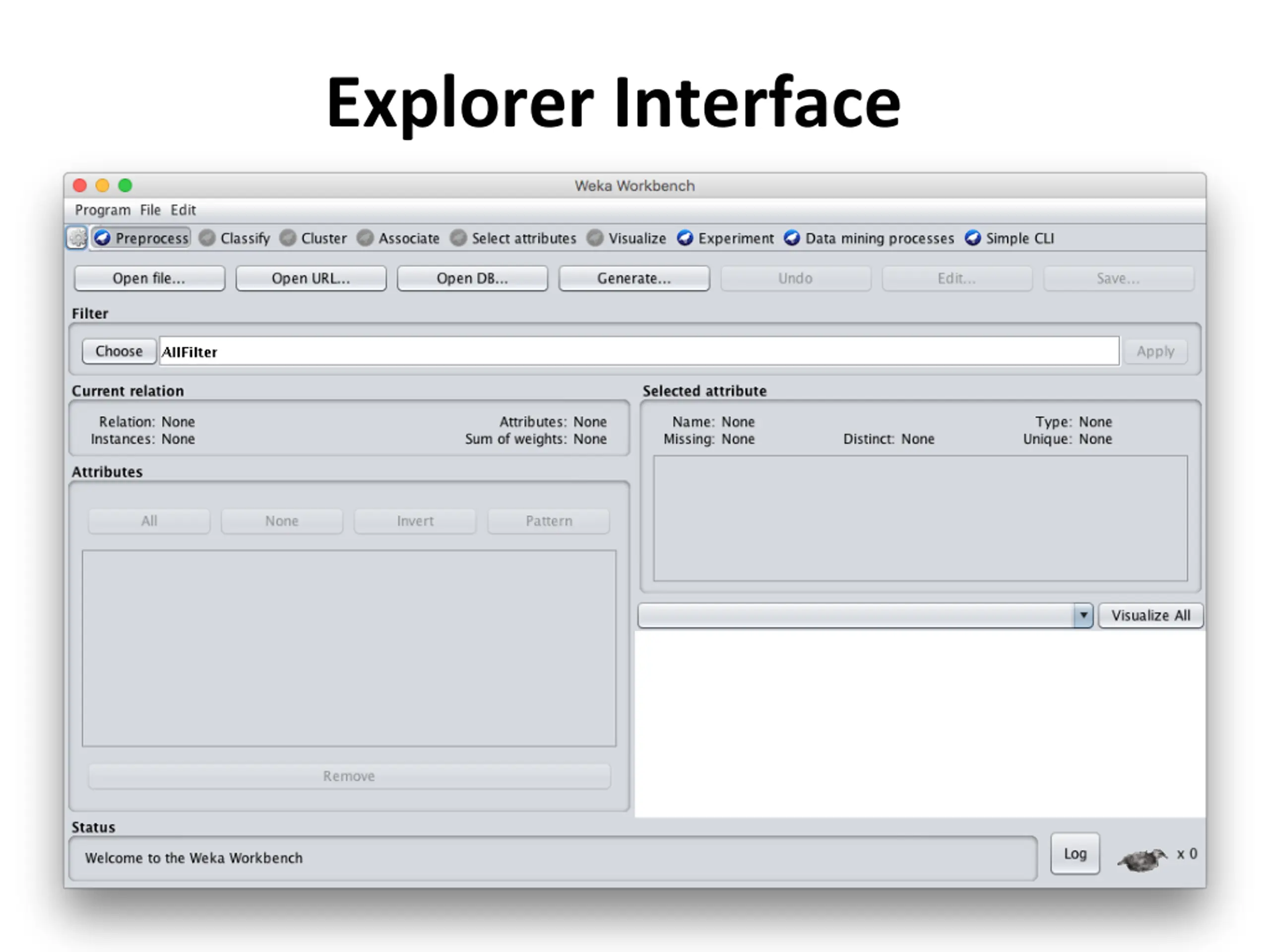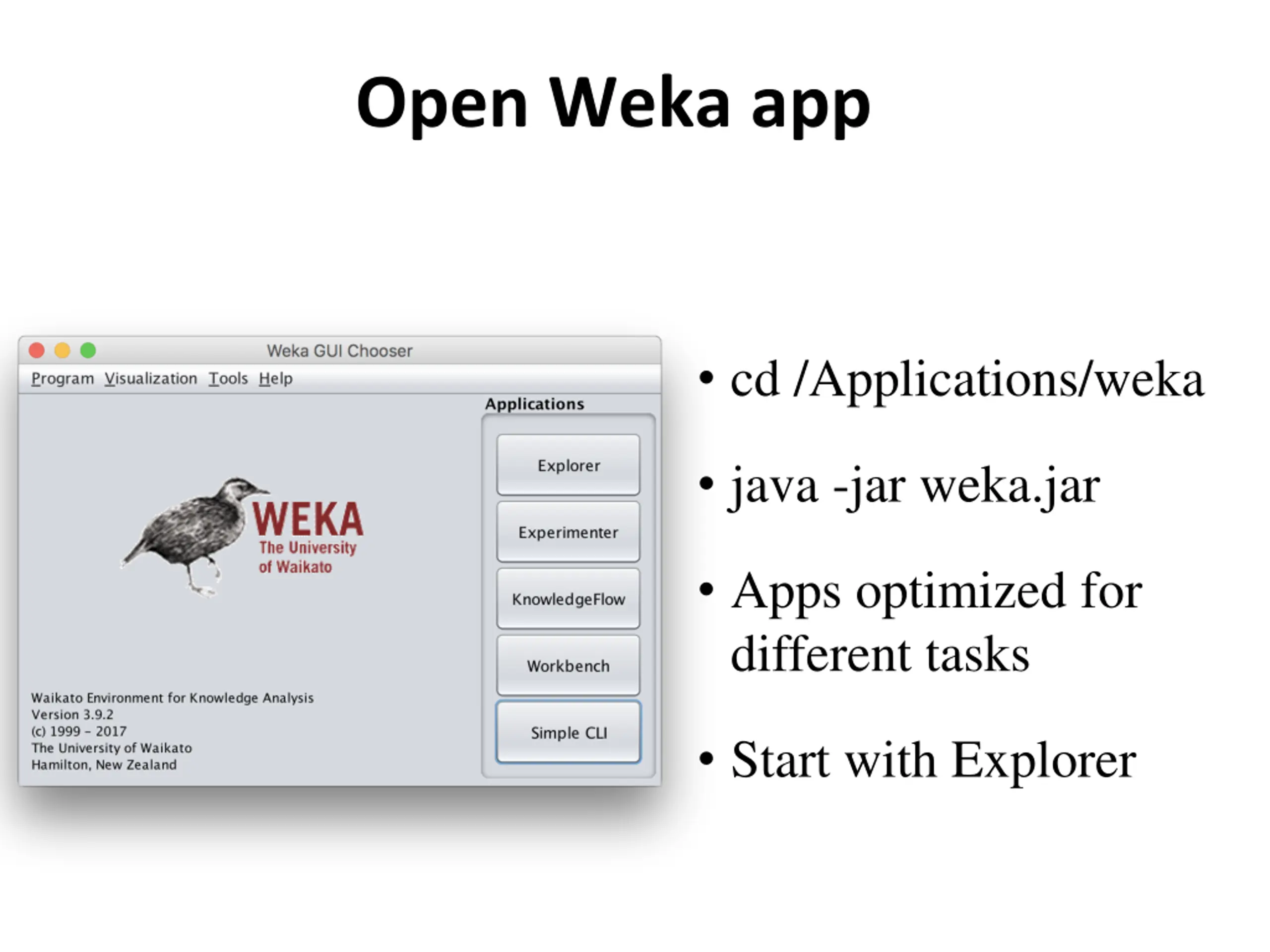 Open Weka app • cd /Applications/weka • java -jar weka.jar • Apps optimized for different tasks • Start with Explorer