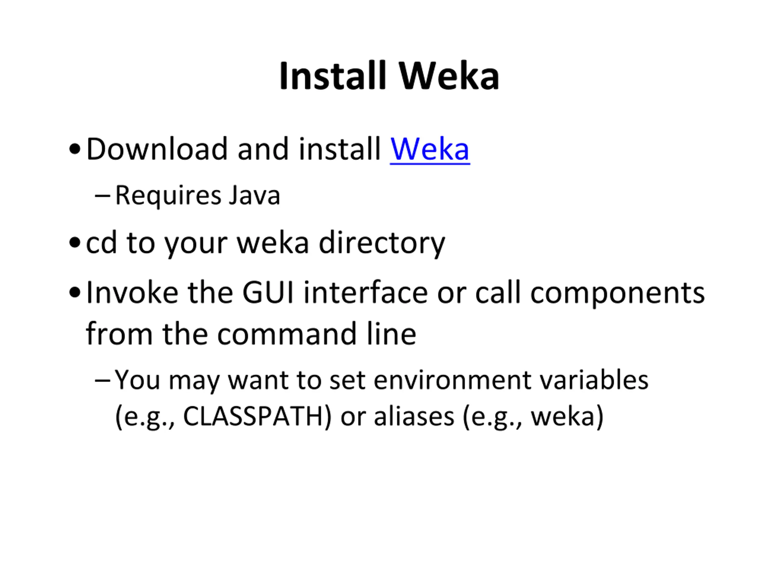 Install Weka •Download and install Weka –Requires Java •cd to your weka directory •Invoke the GUI interface or call components from the command line –You may want to set environment variables (e.g., CLASSPATH) or aliases (e.g., weka)