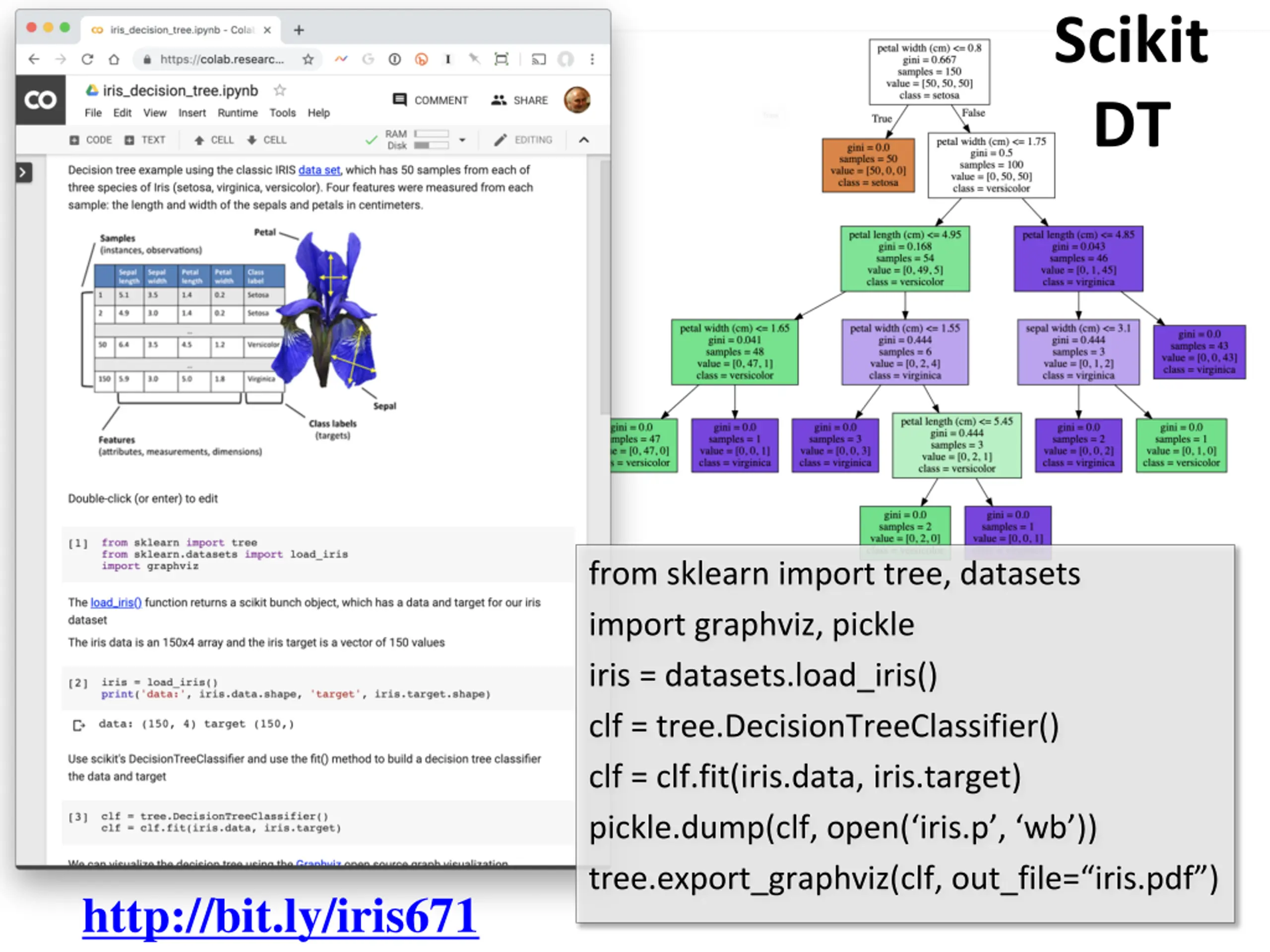 Scikit DT from sklearn import tree, datasets import graphviz, pickle iris = datasets.load_iris() clf = tree.DecisionTreeClassifier() clf = clf.fit(iris.data, iris.target) pickle.dump(clf, open(‘iris.p’, ‘wb’)) tree.export_graphviz(clf, out_file=“iris.pdf”) http://bit.ly/iris671