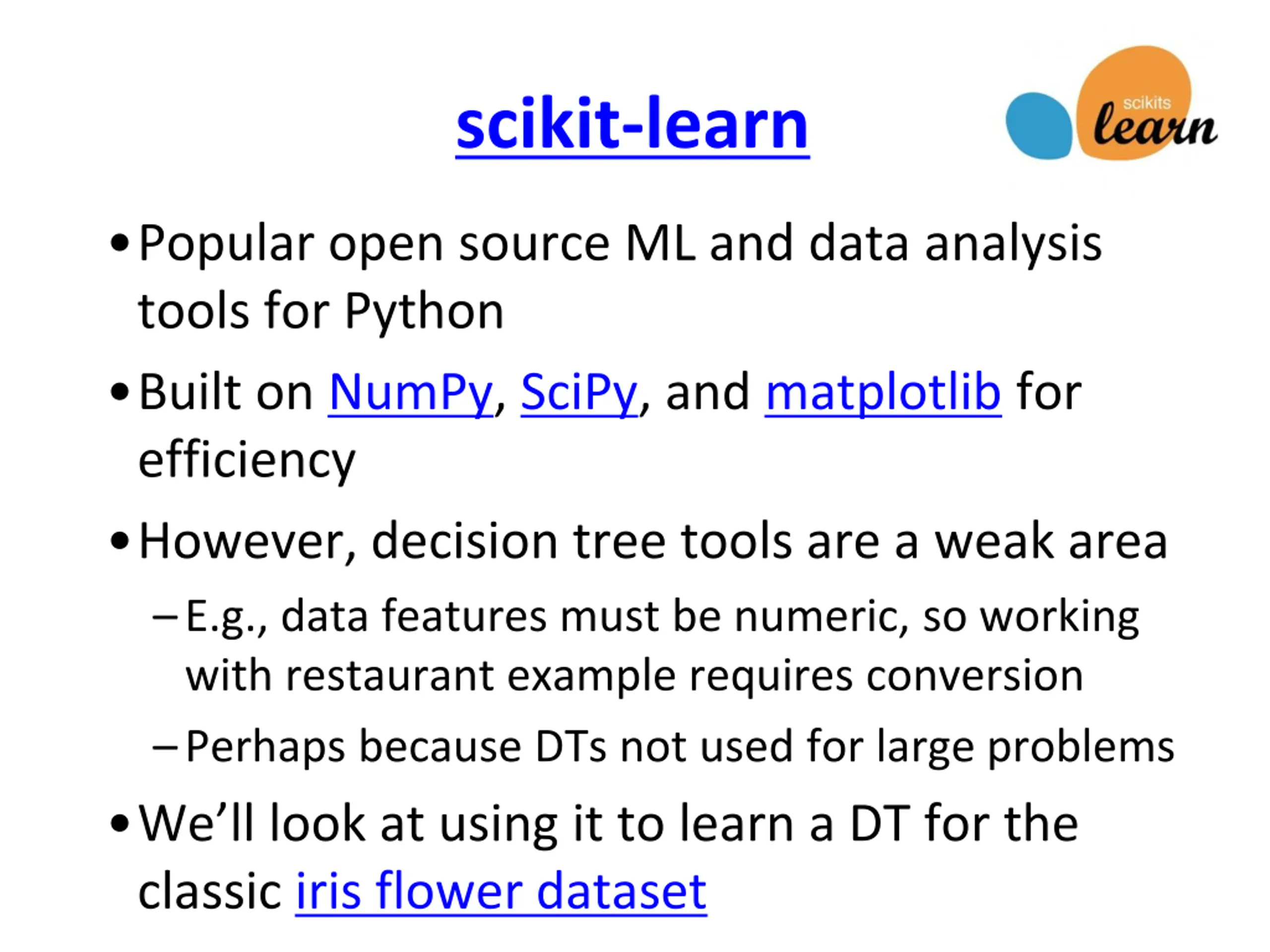 scikit-learn •Popular open source ML and data analysis tools for Python •Built on NumPy, SciPy, and matplotlib for efficiency •However, decision tree tools are a weak area –E.g., data features must be numeric, so working with restaurant example requires conversion –Perhaps because DTs not used for large problems •We’ll look at using it to learn a DT for the classic iris flower dataset