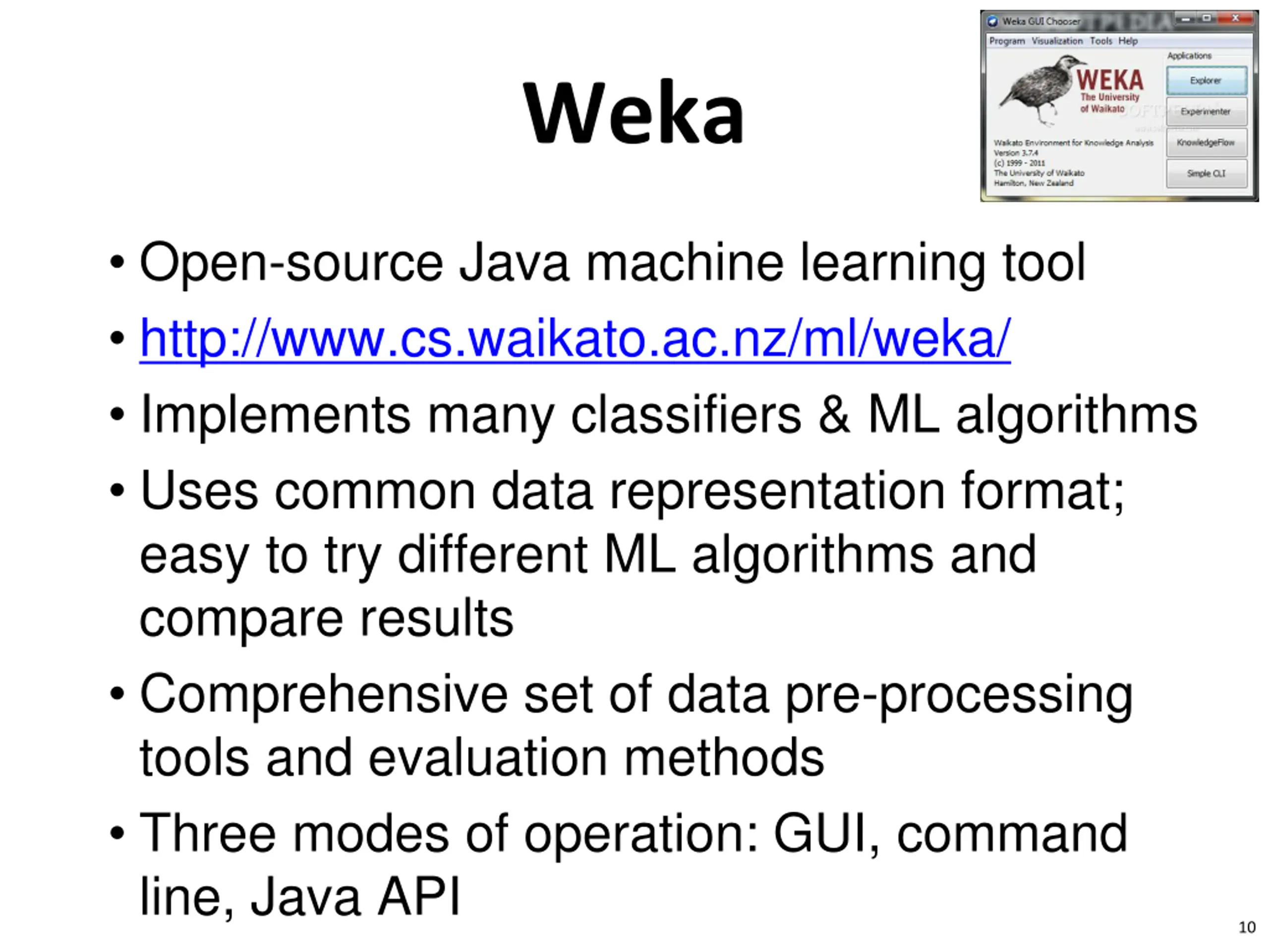 Weka • Open-source Java machine learning tool • http://www.cs.waikato.ac.nz/ml/weka/ • Implements many classifiers & ML algorithms • Uses common data representation format; easy to try different ML algorithms and compare results • Comprehensive set of data pre-processing tools and evaluation methods • Three modes of operation: GUI, command line, Java API 10