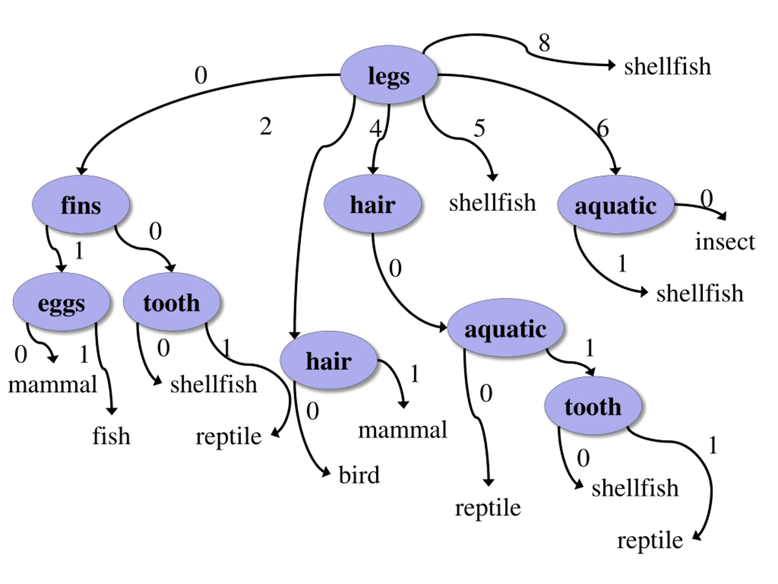 >>> zt.display() Test legs legs = 0 ==> Test fins fins = 0 ==> Test toothed toothed = 0 ==> RESULT = shellfish toothed = 1 ==> RESULT = reptile fins = 1 ==> Test eggs eggs = 0 ==> RESULT = mammal eggs = 1 ==> RESULT = fish legs = 2 ==> Test hair hair = 0 ==> RESULT = bird hair = 1 ==> RESULT = mammal legs = 4 ==> Test hair hair = 0 ==> Test aquatic aquatic = 0 ==> RESULT = reptile aquatic = 1 ==> Test toothed toothed = 0 ==> RESULT = shellfish toothed = 1 ==> RESULT = amphibian hair = 1 ==> RESULT = mammal legs = 5 ==> RESULT = shellfish legs = 6 ==> Test aquatic aquatic = 0 ==> RESULT = insect aquatic = 1 ==> RESULT = shellfish legs = 8 ==> RESULT = shellfish Zoo example Better, but still difficult for people to understand