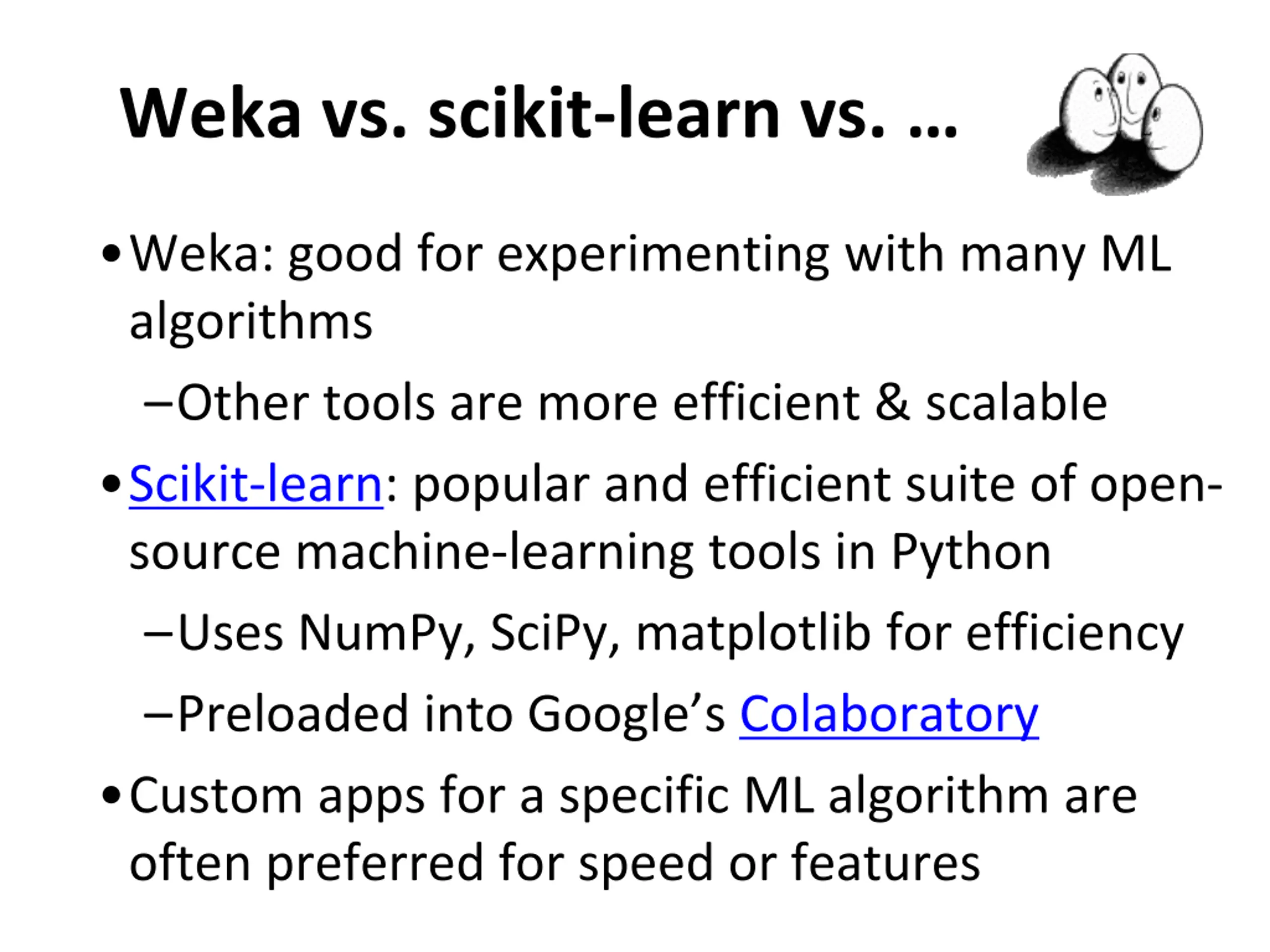 Weka vs. scikit-learn vs. … •Weka: good for experimenting with many ML algorithms –Other tools are more efficient & scalable •Scikit-learn: popular and efficient suite of open- source machine-learning tools in Python –Uses NumPy, SciPy, matplotlib for efficiency –Preloaded into Google’s Colaboratory •Custom apps for a specific ML algorithm are often preferred for speed or features