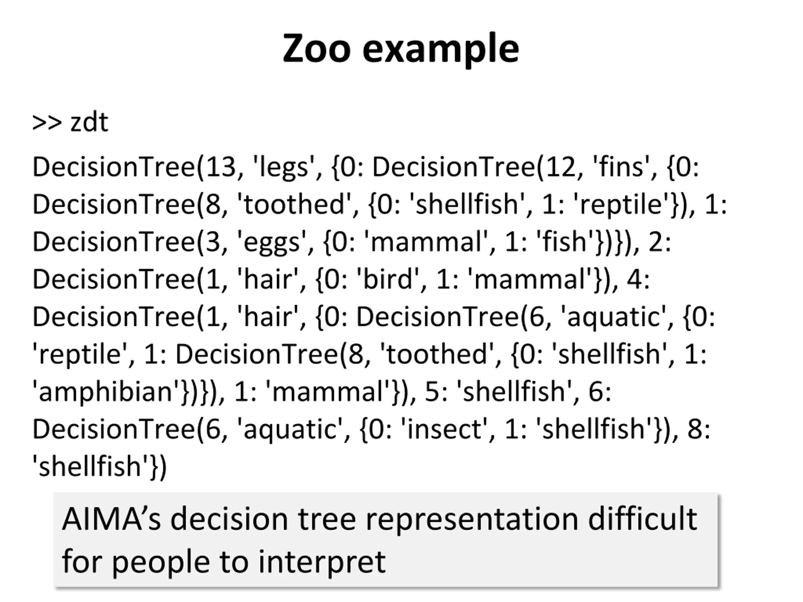 Zoo example >> zdt DecisionTree(13, 'legs', {0: DecisionTree(12, 'fins', {0: DecisionTree(8, 'toothed', {0: 'shellfish', 1: 'reptile'}), 1: DecisionTree(3, 'eggs', {0: 'mammal', 1: 'fish'})}), 2: DecisionTree(1, 'hair', {0: 'bird', 1: 'mammal'}), 4: DecisionTree(1, 'hair', {0: DecisionTree(6, 'aquatic', {0: 'reptile', 1: DecisionTree(8, 'toothed', {0: 'shellfish', 1: 'amphibian'})}), 1: 'mammal'}), 5: 'shellfish', 6: DecisionTree(6, 'aquatic', {0: 'insect', 1: 'shellfish'}), 8: 'shellfish'}) AIMA’s decision tree representation difficult for people to interpret