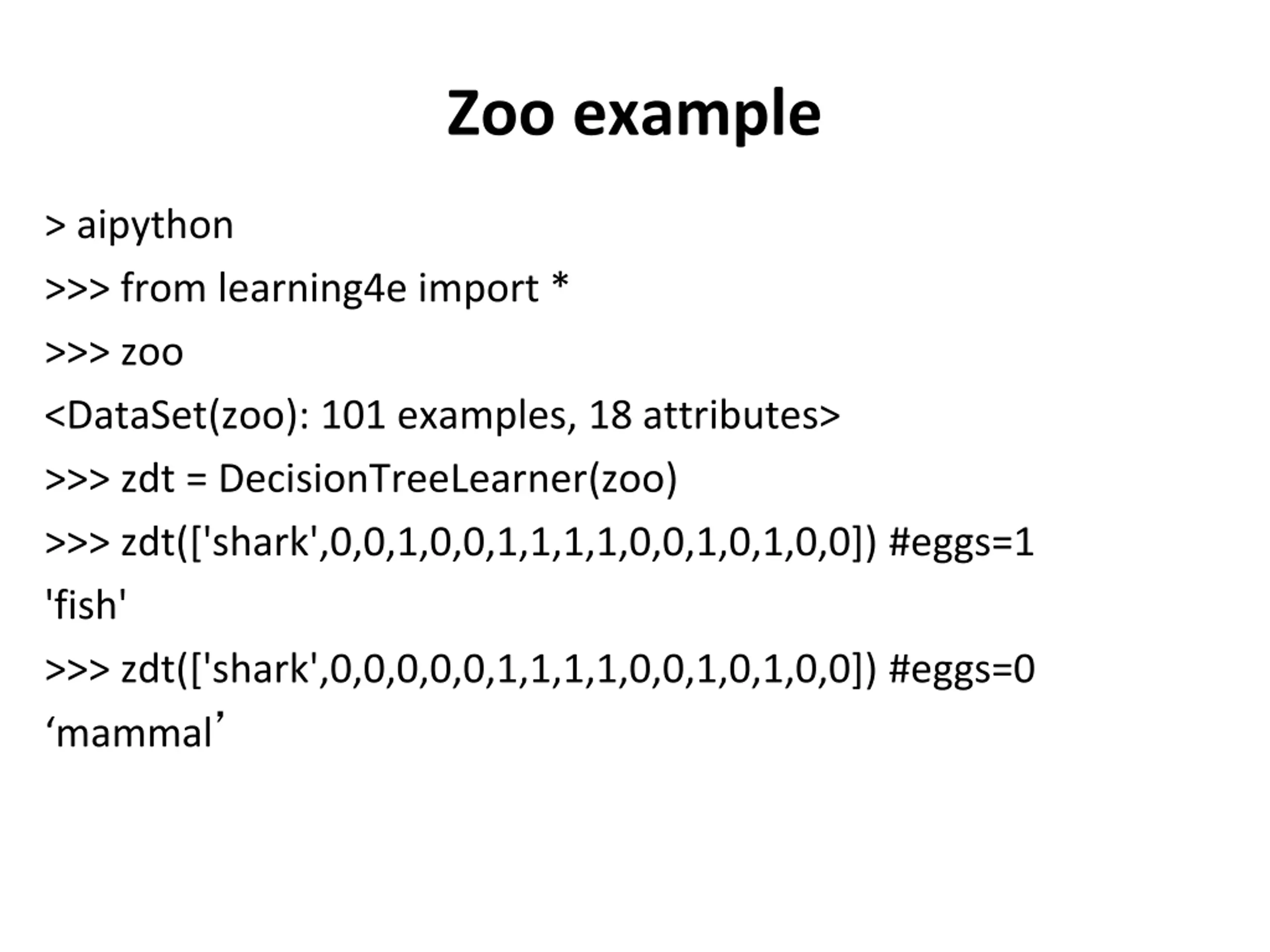 Zoo example > aipython >>> from learning4e import * >>> zoo <DataSet(zoo): 101 examples, 18 attributes> >>> zdt = DecisionTreeLearner(zoo) >>> zdt(['shark',0,0,1,0,0,1,1,1,1,0,0,1,0,1,0,0]) #eggs=1 'fish' >>> zdt(['shark',0,0,0,0,0,1,1,1,1,0,0,1,0,1,0,0]) #eggs=0 ‘mammal’
