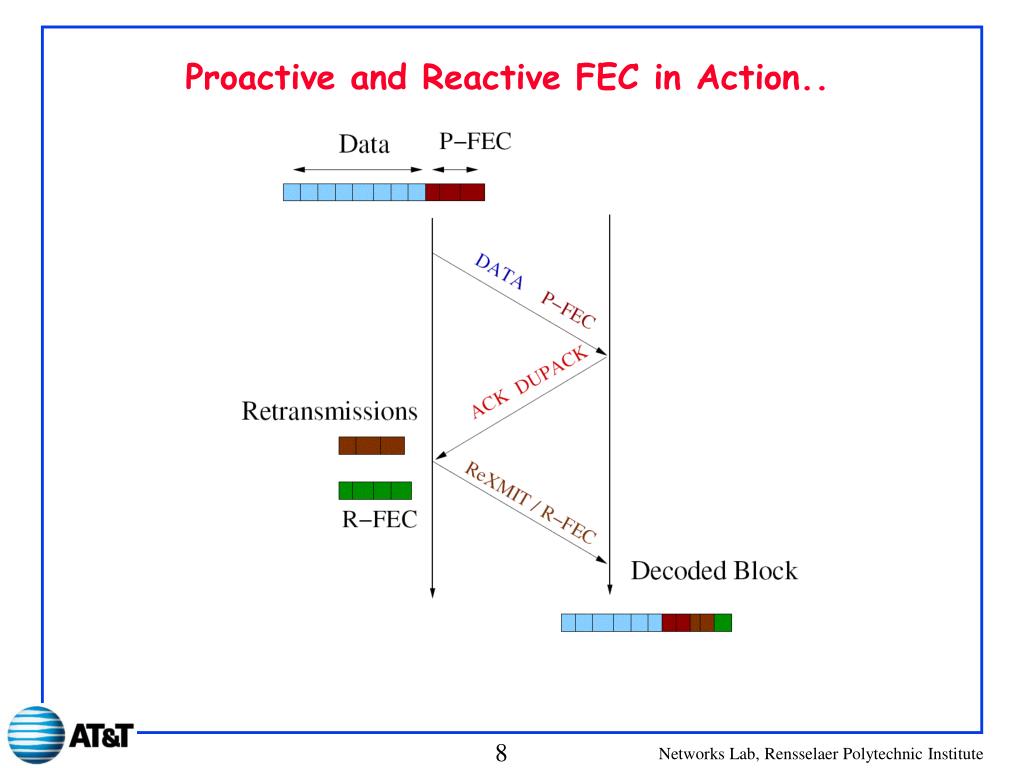 Building Blocks … • Proactive FEC: TCP sender sends data in blocks where the block contains K data segments and R FEC packets. The amount of FEC protection (K) is determined by the current loss estimate. • Proactive FEC based upon estimate of per-window loss rate (Adaptive) • Reactive FEC: Upon receipt of 1 or 2 dupacks, Reactive FEC packets are sent based on the following criteria. • Number of Proactive FEC packets already sent. • Number of holes still left in the decoding block. • Loss rate currently estimated. • Reactive FEC to complement retransmissions