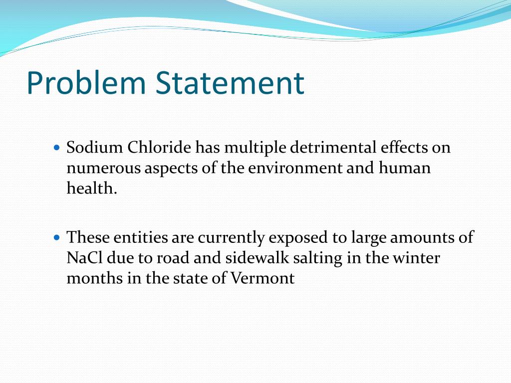 Problem Statement • Sodium Chloride has multiple detrimental effects on numerous aspects of the environment and human health. • These entities are currently exposed to large amounts of NaCl due to road and sidewalk salting in the winter months in the state of Vermont