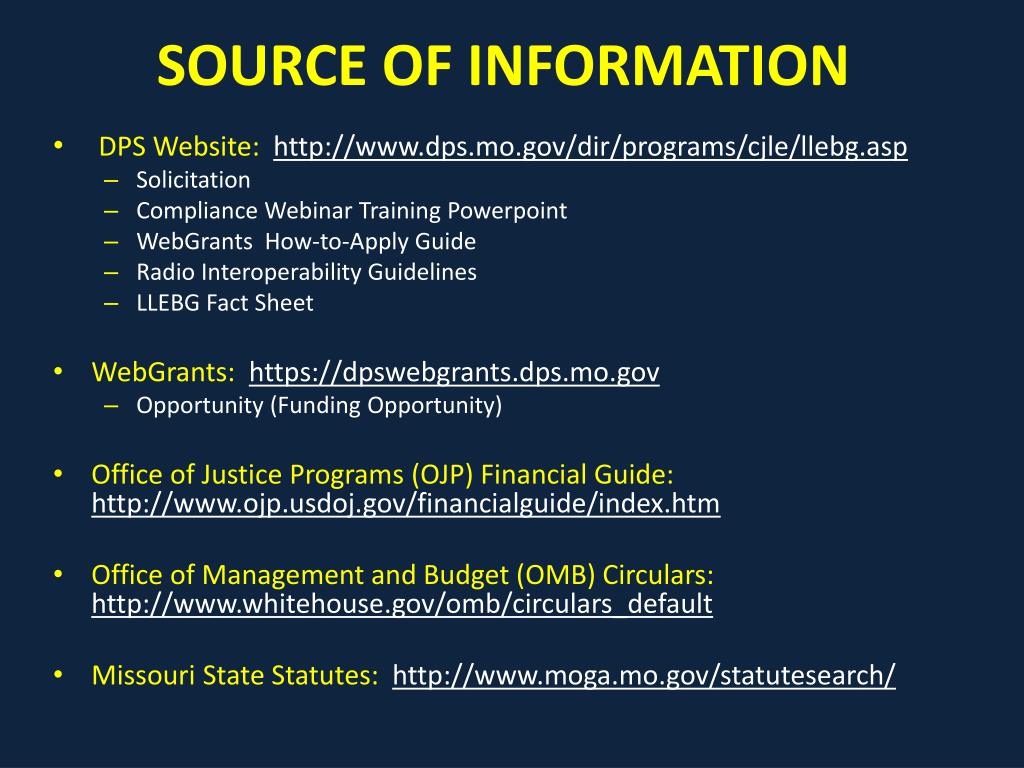 SOURCE OF INFORMATION • DPS Website: http://www.dps.mo.gov/dir/programs/cjle/llebg.asp • Solicitation • Compliance Webinar Training Powerpoint • WebGrants How-to-Apply Guide • Radio Interoperability Guidelines • LLEBG Fact Sheet • WebGrants: https://dpswebgrants.dps.mo.gov • Opportunity (Funding Opportunity) • Office of Justice Programs (OJP) Financial Guide: http://www.ojp.usdoj.gov/financialguide/index.htm • Office of Management and Budget (OMB) Circulars: http://www.whitehouse.gov/omb/circulars_default • Missouri State Statutes: http://www.moga.mo.gov/statutesearch/