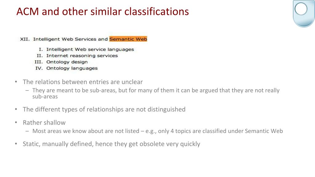 ACM and other similar classifications • The relations between entries are unclear • They are meant to be sub-areas, but for many of them it can be argued that they are not really sub-areas • The different types of relationships are not distinguished • Rather shallow • Most areas we know about are not listed– e.g., only 4 topics are classified under Semantic Web • Static, manually defined, hence they get obsolete very quickly