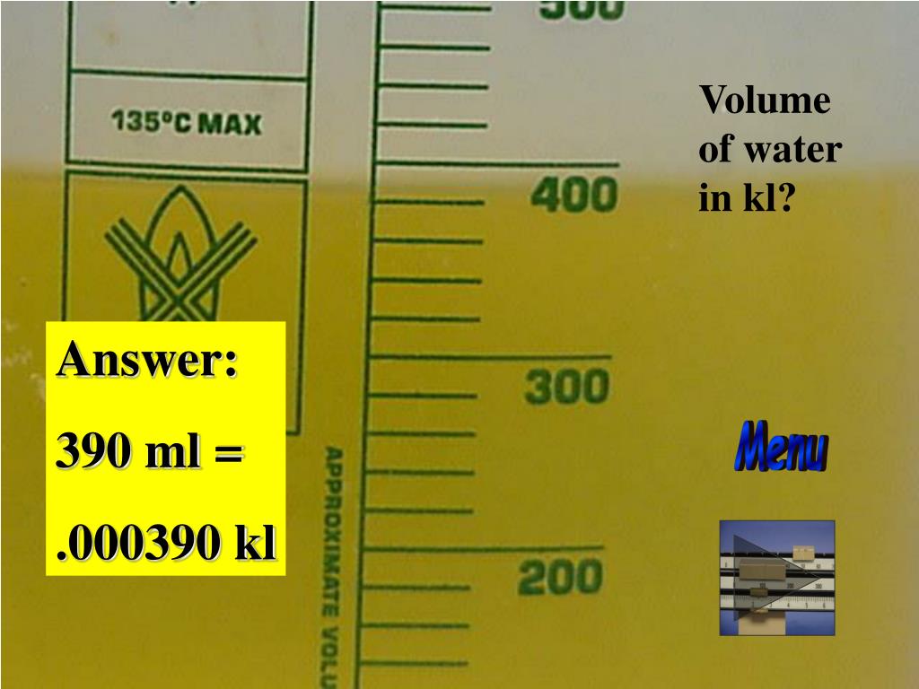 Volume of water in L? Menu Answer: 250 ml = .250 L