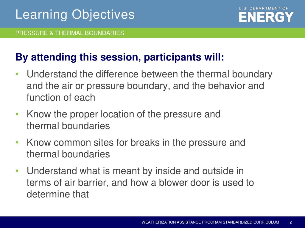 Learning Objectives PRESSURE & THERMAL BOUNDARIES By attending this session, participants will: • Understand the difference between the thermal boundary and the air or pressure boundary, and the behavior and function of each • Know the proper location of the pressure and thermal boundaries • Know common sites for breaks in the pressure and thermal boundaries • Understand what is meant by inside and outside in terms of air barrier, and how a blower door is used to determine that