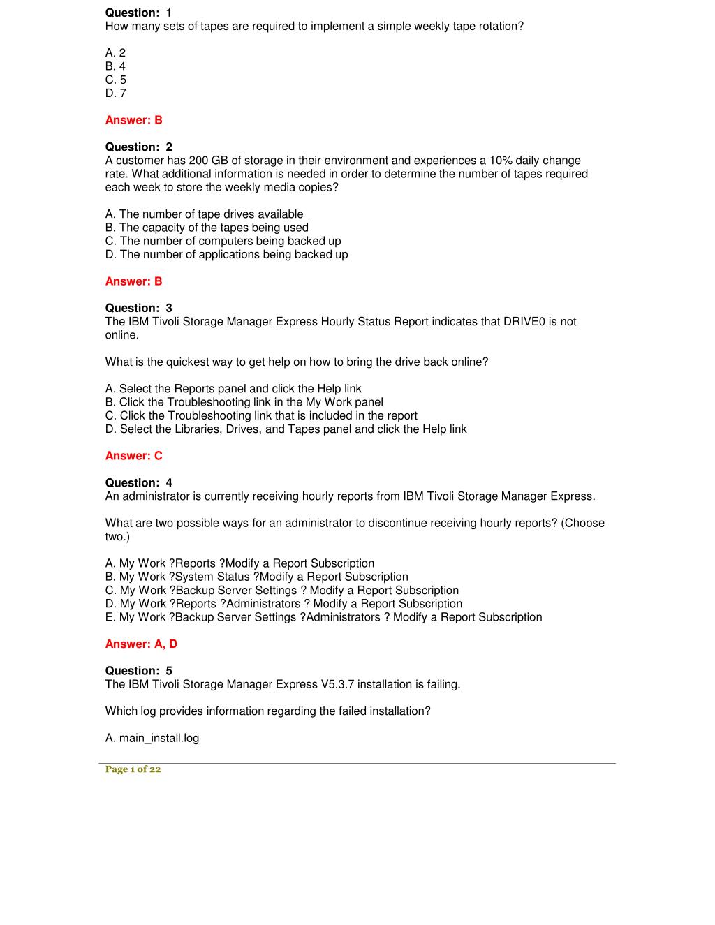 Question: 1 How many sets of tapes are required to implement a simple weekly tape rotation? A. 2 B. 4 C. 5 D. 7 Answer: B Question: 2 A customer has 200 GB of storage in their environment and experiences a 10% daily change rate. What additional information is needed in order to determine the number of tapes required each week to store the weekly media copies? A. The number of tape drives available B. The capacity of the tapes being used C. The number of computers being backed up D. The number of applications being backed up Answer: B Question: 3 The IBM Tivoli Storage Manager Express Hourly Status Report indicates that DRIVE0 is not online. What is the quickest way to get help on how to bring the drive back online? A. Select the Reports panel and click the Help link B. Click the Troubleshooting link in the My Work panel C. Click the Troubleshooting link that is included in the report D. Select the Libraries, Drives, and Tapes panel and click the Help link Answer: C Question: 4 An administrator is currently receiving hourly reports from IBM Tivoli Storage Manager Express. What are two possible ways for an administrator to discontinue receiving hourly reports? (Choose two.) A. My Work ?Reports ?Modify a Report Subscription B. My Work ?System Status ?Modify a Report Subscription C. My Work ?Backup Server Settings ? Modify a Report Subscription D. My Work ?Reports ?Administrators ? Modify a Report Subscription E. My Work ?Backup Server Settings ?Administrators ? Modify a Report Subscription Answer: A, D Question: 5 The IBM Tivoli Storage Manager Express V5.3.7 installation is failing. Which log provides information regarding the failed installation? A. main_install.log Page 1 of 22