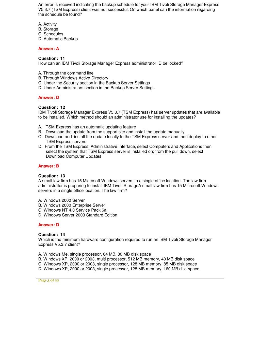 An error is received indicating the backup schedule for your IBM Tivoli Storage Manager Express V5.3.7 (TSM Express) client was not successful. On which panel can the information regarding the schedule be found? A. Activity B. Storage C. Schedules D. Automatic Backup Answer: A Question: 11 How can an IBM Tivoli Storage Manager Express administrator ID be locked? A. Through the command line B. Through Windows Active Directory C. Under the Security section in the Backup Server Settings D. Under Administrators section in the Backup Server Settings Answer: D Question: 12 IBM Tivoli Storage Manager Express V5.3.7 (TSM Express) has server updates that are available to be installed. Which method should an administrator use for installing the updates? A. TSM Express has an automatic updating feature B. Download the update from the support site and install the update manually C. Download and install the update locally to the TSM Express server and then deploy to other TSM Express servers D. From the TSM Express Administrative Interface, select Computers and Applications then select the system that TSM Express server is installed on; from the pull down, select Download Computer Updates Answer: B Question: 13 A small law firm has 15 Microsoft Windows servers in a single office location. The law firm administrator is preparing to install IBM Tivoli StorageA small law firm has 15 Microsoft Windows servers in a single office location. The law firm? A. Windows 2000 Server B. Windows 2000 Enterprise Server C. Windows NT 4.0 Service Pack 6a D. Windows Server 2003 Standard Edition Answer: D Question: 14 Which is the minimum hardware configuration required to run an IBM Tivoli Storage Manager Express V5.3.7 client? A. Windows Me, single processor, 64 MB, 80 MB disk space B. Windows XP, 2000 or 2003, multi processor, 512 MB memory, 40 MB disk space C. Windows XP, 2000 or 2003, single processor, 128 MB memory, 85 MB disk space D. Windows XP, 2000 or 2003, single processor, 128 MB memory, 160 MB disk space Page 3 of 22