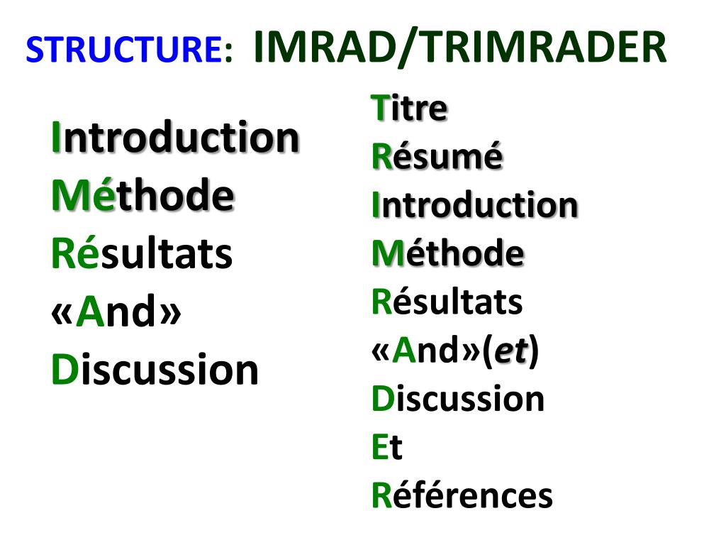 STRUCTURE: IMRAD/TRIMRADER Titre Résumé Introduction Méthode Résultats «And»(et) Discussion Et Références Introduction Méthode Résultats «And» Discussion