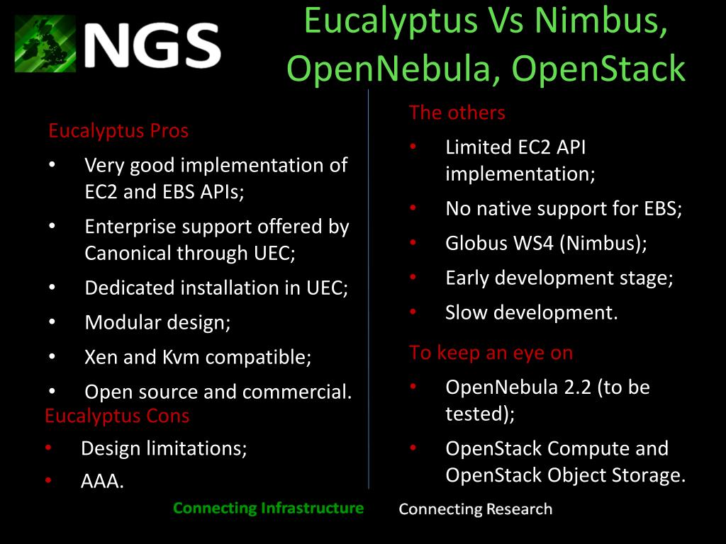 Eucalyptus Vs Nimbus, OpenNebula, OpenStack The others • Limited EC2 API implementation; • No native support for EBS; • Globus WS4 (Nimbus); • Early development stage; • Slow development. Eucalyptus Pros • Very good implementation of EC2 and EBS APIs; • Enterprise support offered by Canonical through UEC; • Dedicated installation in UEC; • Modular design; • Xen and Kvm compatible; • Open source and commercial. To keep an eye on • OpenNebula 2.2 (to be tested); • OpenStack Compute and OpenStack Object Storage. Eucalyptus Cons • Design limitations; • AAA.