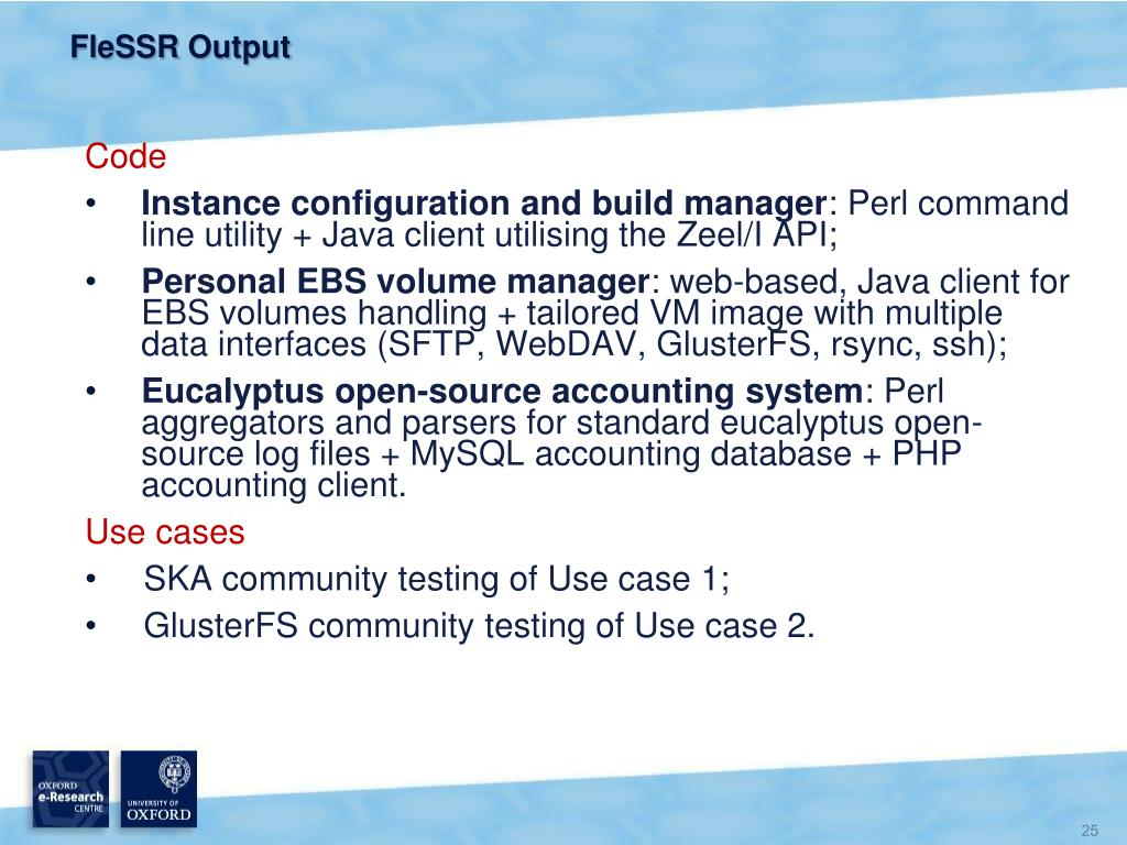 FleSSR Output Code • Instance configuration and build manager: Perl command line utility + Java client utilising the Zeel/I API; • Personal EBS volume manager: web-based, Java client for EBS volumes handling + tailored VM image with multiple data interfaces (SFTP, WebDAV, GlusterFS, rsync, ssh); • Eucalyptus open-source accounting system: Perl aggregators and parsers for standard eucalyptus open-source log files + MySQL accounting database + PHP accounting client. Use cases • SKA community testing of Use case 1; • GlusterFS community testing of Use case 2.