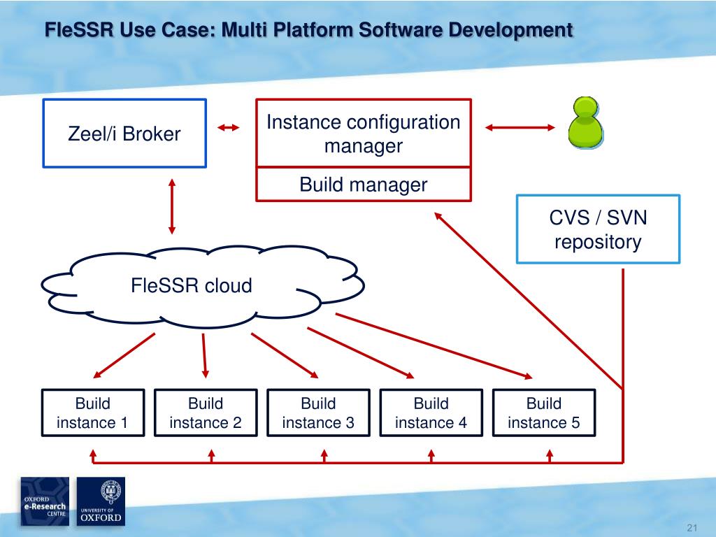 FleSSR Use Case: Multi Platform Software Development Zeel/i Broker Instance configuration manager Build manager CVS / SVN repository FleSSR cloud Build instance 1 Build instance 2 Build instance 3 Build instance 4 Build instance 5