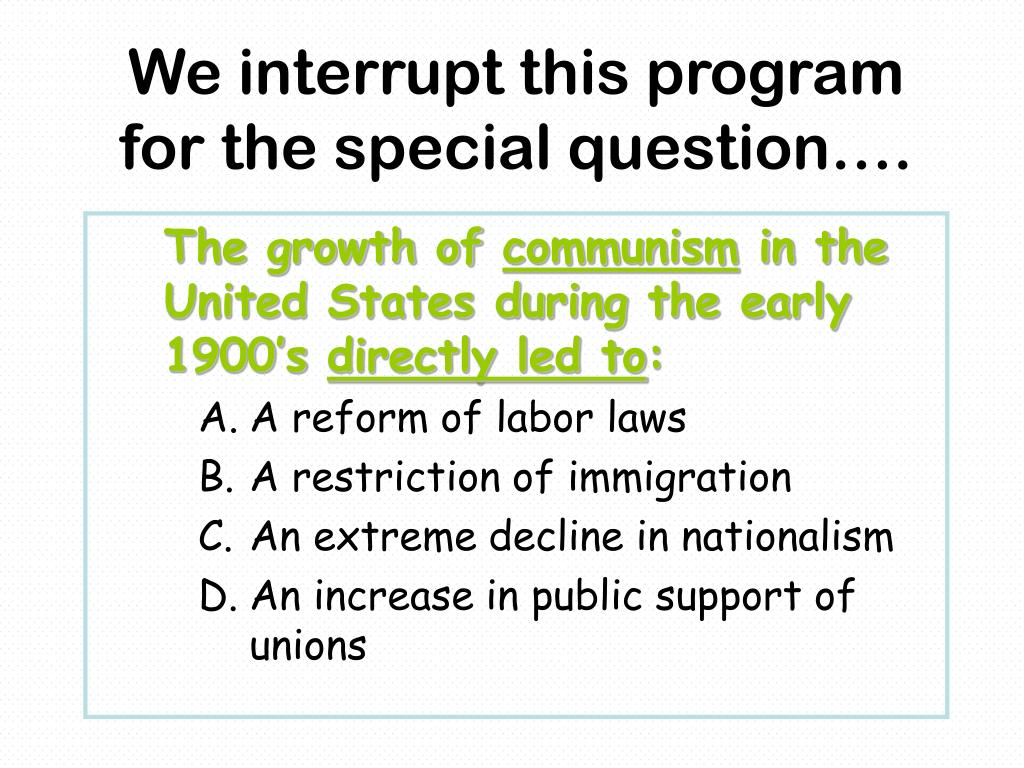 We interrupt this program for the special question…. The growth of communism in the United States during the early 1900’s directly led to: • A reform of labor laws • A restriction of immigration • An extreme decline in nationalism • An increase in public support of unions