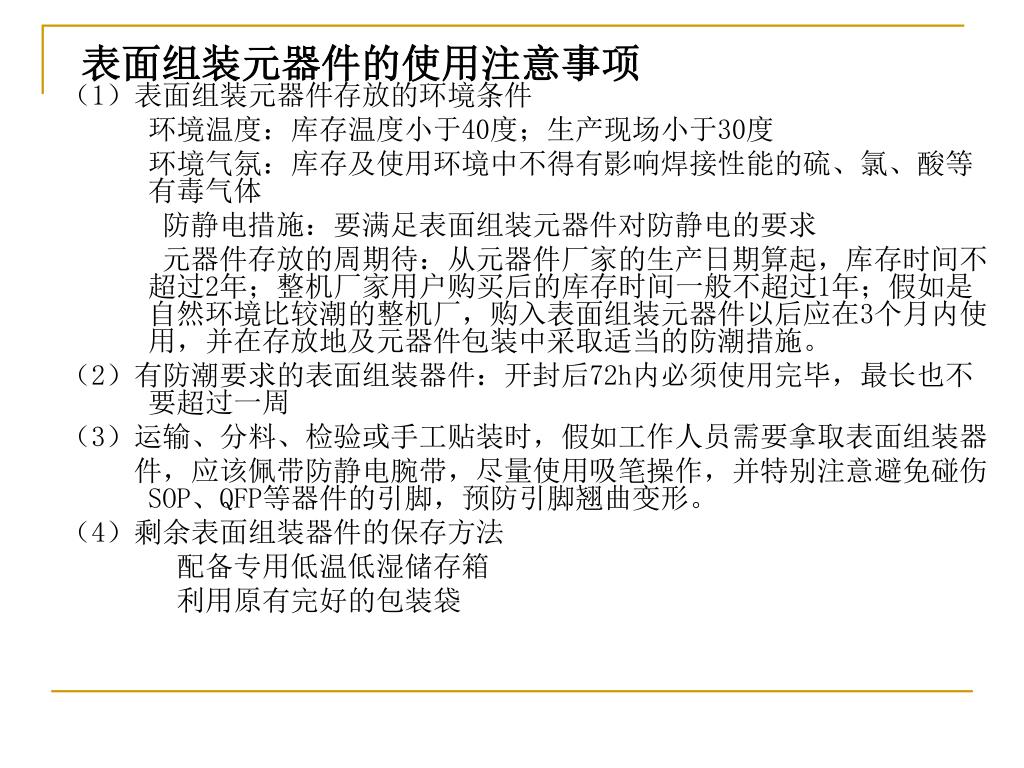 表面组装元器件的使用注意事项 (1)表面组装元器件存放的环境条件 环境温度:库存温度小于40度;生产现场小于30度 环境气氛:库存及使用环境中不得有影响焊接性能的硫、氯、酸等有毒气体 防静电措施:要满足表面组装元器件对防静电的要求 元器件存放的周期待:从元器件厂家的生产日期算起,库存时间不超过2年;整机厂家用户购买后的库存时间一般不超过1年;假如是自然环境比较潮的整机厂,购入表面组装元器件以后应在3个月内使用,并在存放地及元器件包装中采取适当的防潮措施。 (2)有防潮要求的表面组装器件:开封后72h内必须使用完毕,最长也不要超过一周 (3)运输、分料、检验或手工贴装时,假如工作人员需要拿取表面组装器 件,应该佩带防静电腕带,尽量使用吸笔操作,并特别注意避免碰伤SOP、QFP等器件的引脚,预防引脚翘曲变形。 (4)剩余表面组装器件的保存方法 配备专用低温低湿储存箱 利用原有完好的包装袋