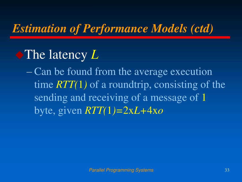 Estimation of Performance Models (ctd) • The latency L • Can be found from the average execution time RTT(1) of a roundtrip, consisting of the sending and receiving of a message of 1 byte, given RTT(1)=2xL+4xo Parallel Programming Systems