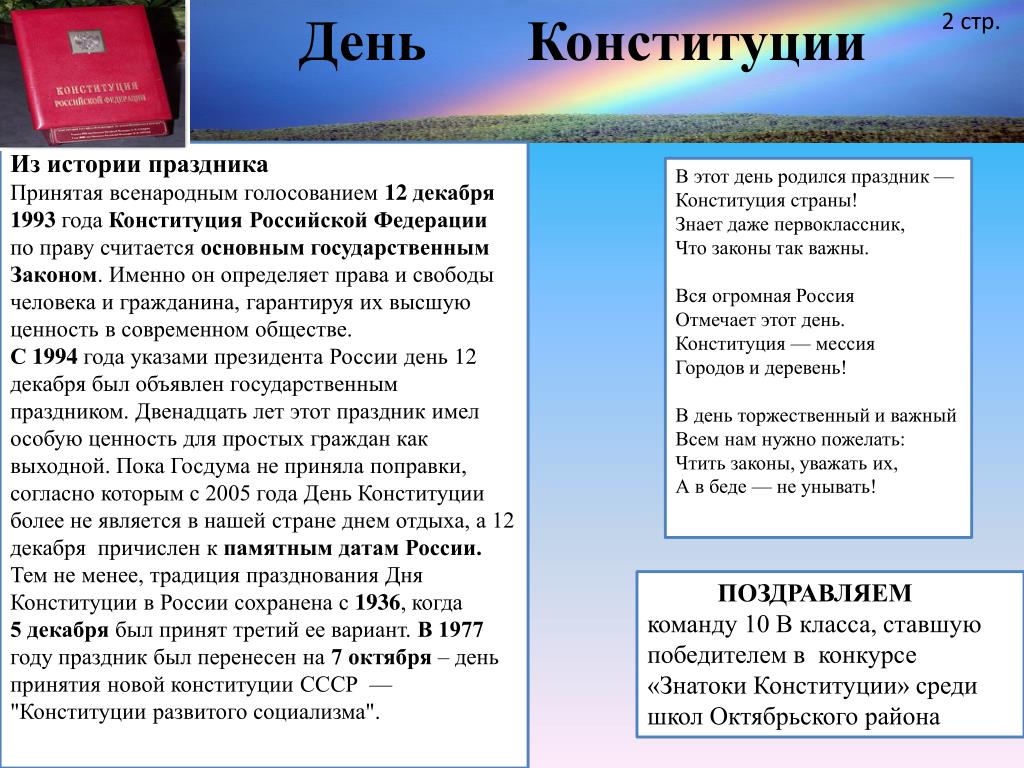 2. День Конституции 2 стр. Из истории праздника Принятая всенародным голосованием 12 декабря 1993 года Конституция Российской Федерации по праву считается основным государственным Законом. Именно он определяет права и свободы человека и гражданина, гарантируя их высшую ценность в современном обществе. С 1994 года указами президента России день 12 декабря был объявлен государственным праздником. Двенадцать лет этот праздник имел особую ценность для простых граждан как выходной. Пока Госдума не приняла поправки, согласно которым с 2005 года День Конституции более не является в нашей стране днем отдыха, а 12 декабря причислен к памятным датам России.Тем не менее, традиция празднования Дня Конституции в России сохранена с 1936, когда 5 декабря был принят третий ее вариант. В 1977 году праздник был перенесен на 7 октября – день принятия новой конституции СССР — "Конституции развитого социализма". В этот день родился праздник —Конституция страны!Знает даже первоклассник,Что законы так важны.Вся огромная РоссияОтмечает этот день.Конституция — мессияГородов и деревень!В день торжественный и важныйВсем нам нужно пожелать:Чтить законы, уважать их,А в беде — не унывать! ПОЗДРАВЛЯЕМ команду 10 В класса, ставшую победителем в конкурсе «Знатоки Конституции» среди школ Октябрьского района