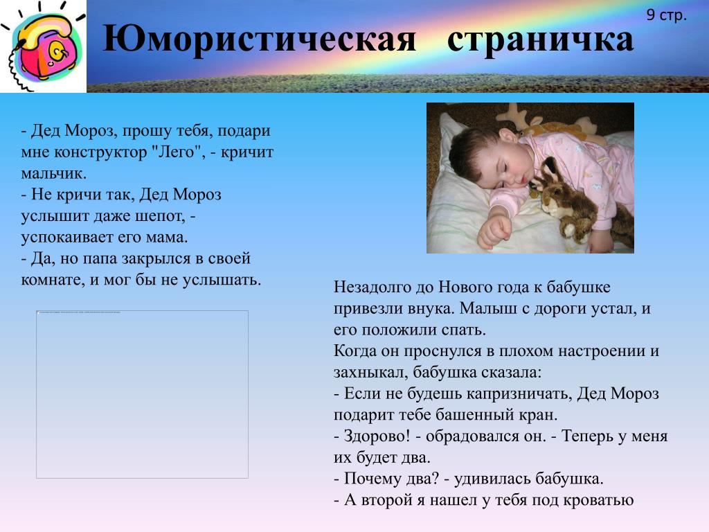8. 9 стр. Юмористическая страничка - Дед Мороз, прошу тебя, подари мне конструктор "Лего", - кричит мальчик. - Не кричи так, Дед Мороз услышит даже шепот, - успокаивает его мама. - Да, но папа закрылся в своей комнате, и мог бы не услышать. Незадолго до Нового года к бабушке привезли внука. Малыш с дороги устал, и его положили спать.Когда он проснулся в плохом настроении и захныкал, бабушка сказала: - Если не будешь капризничать, Дед Мороз подарит тебе башенный кран. - Здорово! - обрадовался он. - Теперь у меня их будет два. - Почему два? - удивилась бабушка. - А второй я нашел у тебя под кроватью