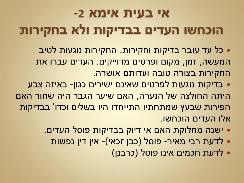 אי בעית אימא 2- הוכחשו העדים בבדיקות ולא בחקירות • כל עד עובר בדיקות וחקירות. החקירות נוגעות לטיב המעשה, זמן, מקום ופרטים מדוייקים. העדים עברו את החקירות בצורה טובה ועדותם אושרה. • בדיקות נוגעות לפרטים שאינם ישירים כגון- באיזה צבע היתה החולצה של הנערה, האם שיער הגבר היה שחור האם הפירות שבעץ שמתחתיו התייחדו היו בשלים וכדו' בבדיקות אלו העדים הוכחשו. • ישנה מחלוקת האם אי דיוק בבדיקות פוסל העדים. • לדעת רבי מאיר- פוסל (כבן זכאי)- אין דין נפשות • לדעת חכמים אינו פוסל (כרבנן)