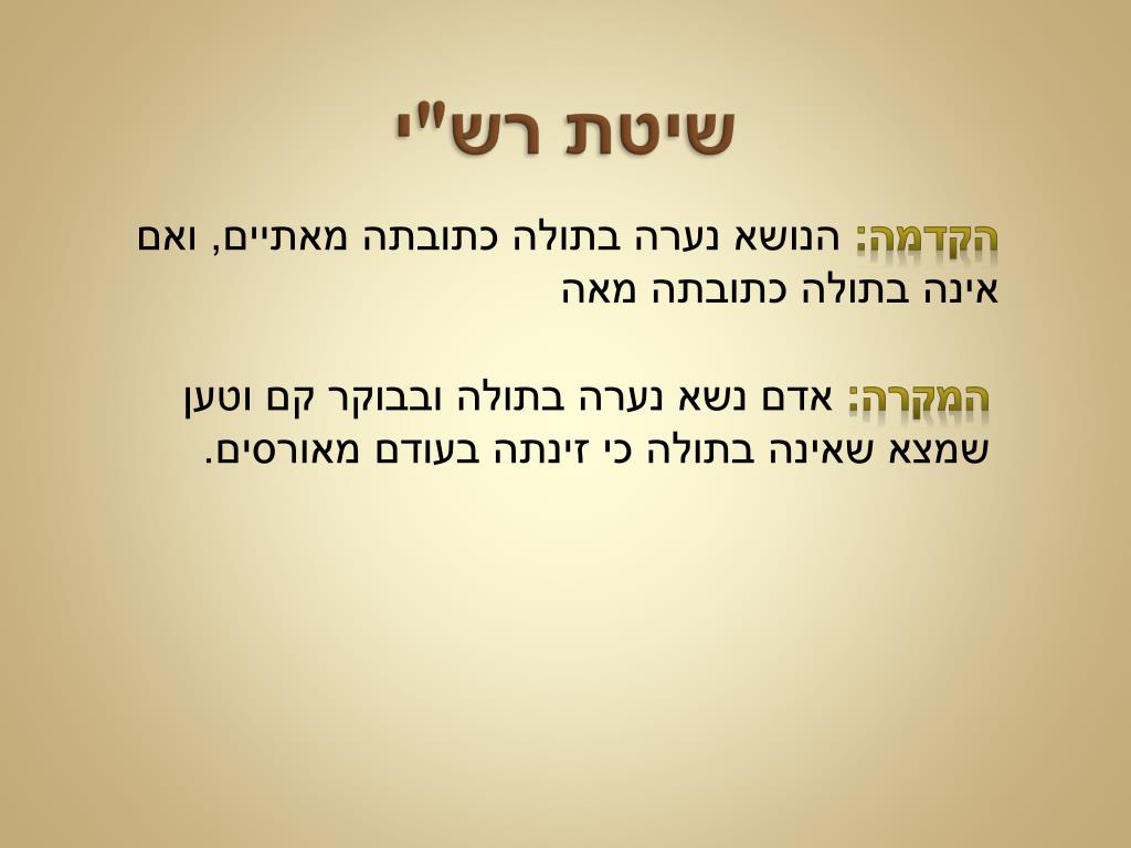 שיטת רש"י הקדמה: הנושא נערה בתולה כתובתה מאתיים, ואם אינה בתולה כתובתה מאה המקרה: אדם נשא נערה בתולה ובבוקר קם וטען שמצא שאינה בתולה כי זינתה בעודם מאורסים.