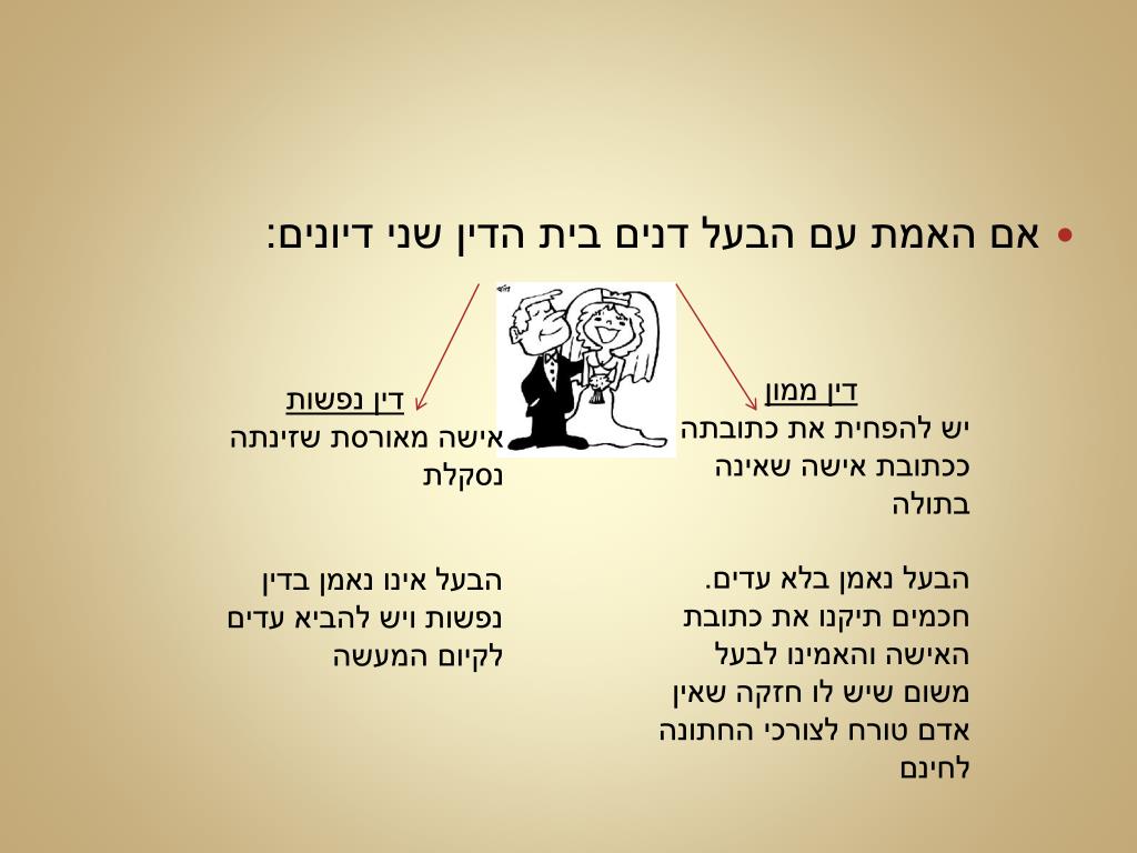 אם האמת עם הבעל דנים בית הדין שני דיונים: דין ממון יש להפחית את כתובתה ככתובת אישה שאינה בתולה דין נפשות אישה מאורסת שזינתה נסקלת הבעל נאמן בלא עדים. חכמים תיקנו את כתובת האישה והאמינו לבעל משום שיש לו חזקה שאין אדם טורח לצורכי החתונה לחינם הבעל אינו נאמן בדין נפשות ויש להביא עדים לקיום המעשה