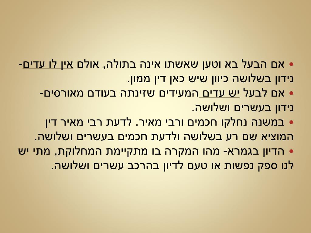 אם הבעל בא וטען שאשתו אינה בתולה, אולם אין לו עדים- נידון בשלושה כיוון שיש כאן דין ממון. • אם לבעל יש עדים המעידים שזינתה בעודם מאורסים- נידון בעשרים ושלושה. • במשנה נחלקו חכמים ורבי מאיר. לדעת רבי מאיר דין המוציא שם רע בשלושה ולדעת חכמים בעשרים ושלושה. • הדיון בגמרא- מהו המקרה בו מתקיימת המחלוקת, מתי יש לנו ספק נפשות או טעם לדיון בהרכב עשרים ושלושה.