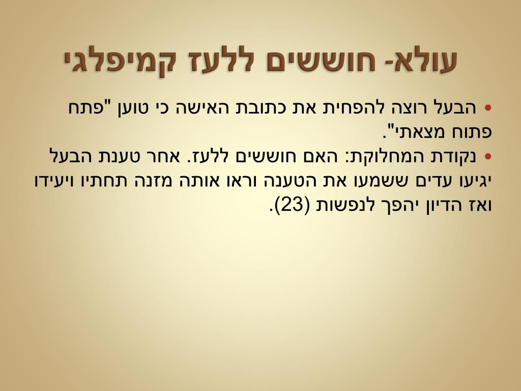 עולא- חוששים ללעז קמיפלגי • הבעל רוצה להפחית את כתובת האישה כי טוען "פתח פתוח מצאתי". • נקודת המחלוקת: האם חוששים ללעז. אחר טענת הבעל יגיעו עדים ששמעו את הטענה וראו אותה מזנה תחתיו ויעידו ואז הדיון יהפך לנפשות (23).