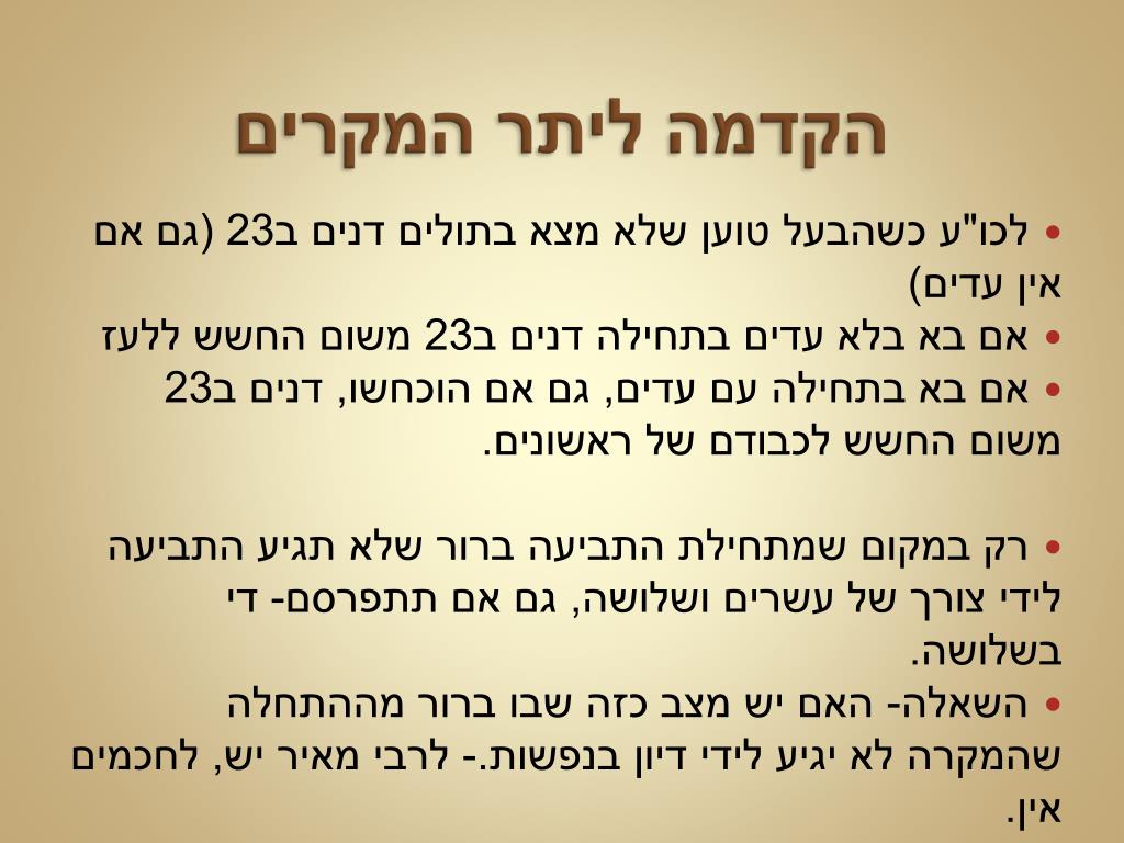 הקדמה ליתר המקרים • לכו"ע כשהבעל טוען שלא מצא בתולים דנים ב23 (גם אם אין עדים) • אם בא בלא עדים בתחילה דנים ב23 משום החשש ללעז • אם בא בתחילה עם עדים, גם אם הוכחשו, דנים ב23 משום החשש לכבודם של ראשונים. • רק במקום שמתחילת התביעה ברור שלא תגיע התביעה לידי צורך של עשרים ושלושה, גם אם תתפרסם- די בשלושה. • השאלה- האם יש מצב כזה שבו ברור מההתחלה שהמקרה לא יגיע לידי דיון בנפשות.- לרבי מאיר יש, לחכמים אין.