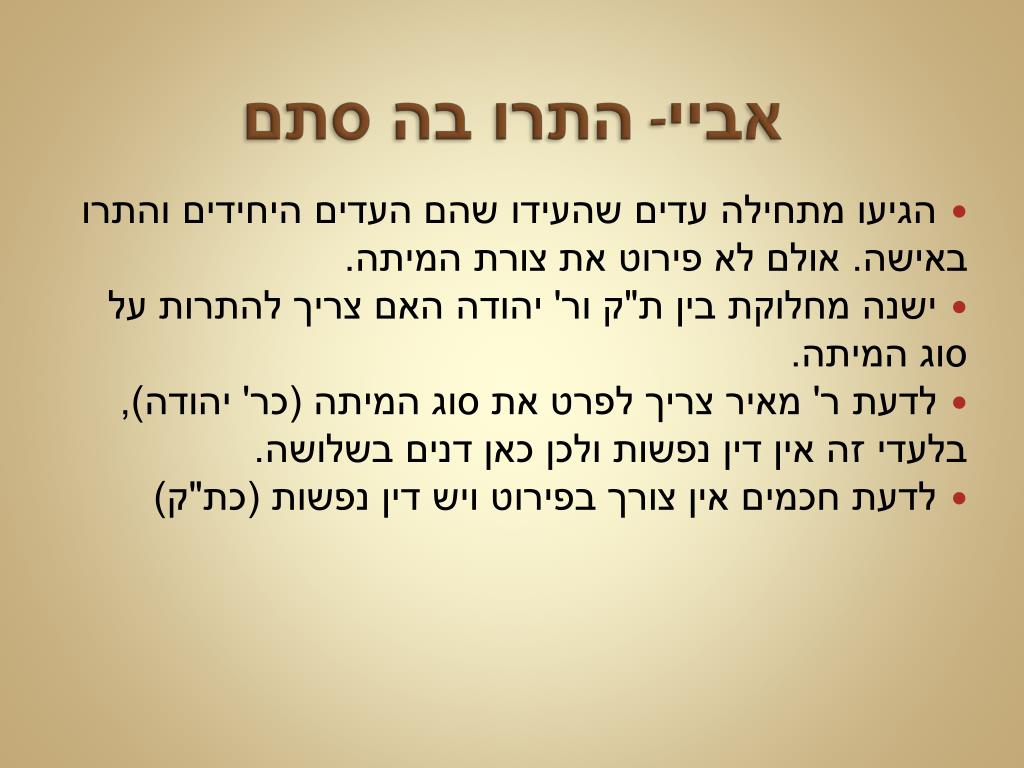 אביי- התרו בה סתם • הגיעו מתחילה עדים שהעידו שהם העדים היחידים והתרו באישה. אולם לא פירוט את צורת המיתה. • ישנה מחלוקת בין ת"ק ור' יהודה האם צריך להתרות על סוג המיתה. • לדעת ר' מאיר צריך לפרט את סוג המיתה (כר' יהודה), בלעדי זה אין דין נפשות ולכן כאן דנים בשלושה. • לדעת חכמים אין צורך בפירוט ויש דין נפשות (כת"ק)