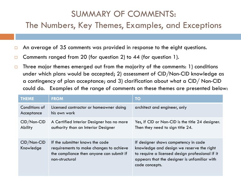 SUMMARY OF COMMENTS:The Numbers, Key Themes, Examples, and Exceptions • An average of 35 comments was provided in response to the eight questions. • Comments ranged from 20 (for question 2) to 44 (for question 1). • Three major themes emerged out from the majority of the comments: 1) conditions under which plans would be accepted; 2) assessment of CID/Non-CID knowledge as a contingency of plan acceptance; and 3) clarification about what a CID/ Non-CID could do. Examples of the range of comments on these themes are presented below: