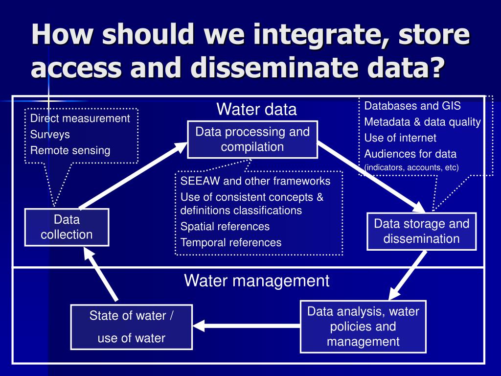 How should we integrate, store access and disseminate data? Water data Databases and GIS Metadata & data quality Use of internet Audiences for data (indicators, accounts, etc) Direct measurement Surveys Remote sensing Data processing and compilation SEEAW and other frameworks Use of consistent concepts & definitions classifications Spatial references Temporal references Data collection Data storage and dissemination Water management Data analysis, water policies and management State of water / use of water