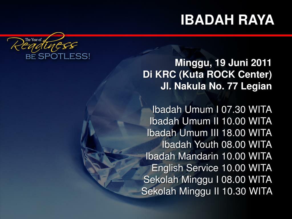 PENGUMUMAN. IBADAH RAYA. Minggu , 19 Juni 2011 Di KRC ( Kuta ROCK Center) Jl. Nakula No. 77 Legian Ibadah Umum I 07.30 WITA Ibadah Umum II 10.00 WITA Ibadah Umum III 18.00 WITA Ibadah Youth 08.00 WITA Ibadah Mandarin 10.00 WITA English Service 10.00 WITA