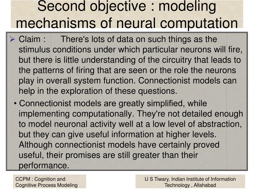 Second objective : modeling mechanisms of neural computation • Claim : There's lots of data on such things as the stimulus conditions under which particular neurons will fire, but there is little understanding of the circuitry that leads to the patterns of firing that are seen or the role the neurons play in overall system function. Connectionist models can help in the exploration of these questions. • Connectionist models are greatly simplified, while implementing computationally. They're not detailed enough to model neuronal activity well at a low level of abstraction, but they can give useful information at higher levels. Although connectionist models have certainly proved useful, their promises are still greater than their performance. U S Tiwary, Indian Institute of Information Technology , Allahabad