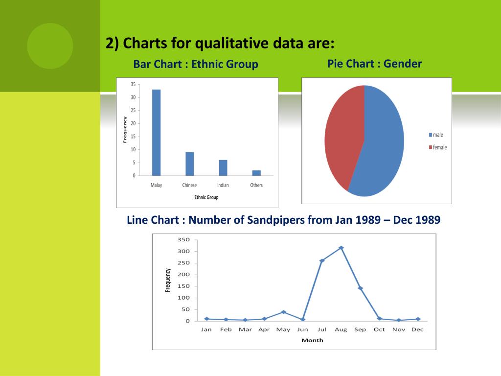 2) Charts for qualitative data are: Pie Chart : Gender Bar Chart : Ethnic Group Line Chart : Number of Sandpipers from Jan 1989 – Dec 1989