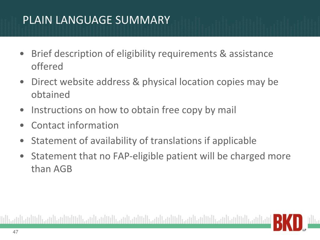 Plain Language Summary • Brief description of eligibility requirements & assistance offered • Direct website address & physical location copies may be obtained • Instructions on how to obtain free copy by mail • Contact information • Statement of availability of translations if applicable • Statement that no FAP-eligible patient will be charged more than AGB 47