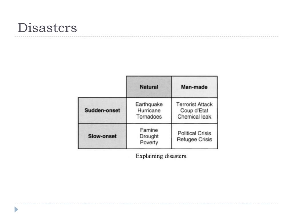 Disasters By 'disaster' we mean 'a disruption that physically affects a system as a whole and threatens its priorities and goals. • Natural Disasters • Man-Made Disasters 97 % of resources are devoted to the relief of man made disasters