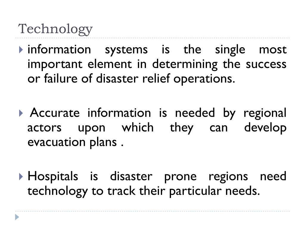 Technology • information systems is the single most important element in determining the success or failure of disaster relief operations. • Accurate information is needed by regional actors upon which they can develop evacuation plans . • Hospitals is disaster prone regions need technology to track their particular needs.