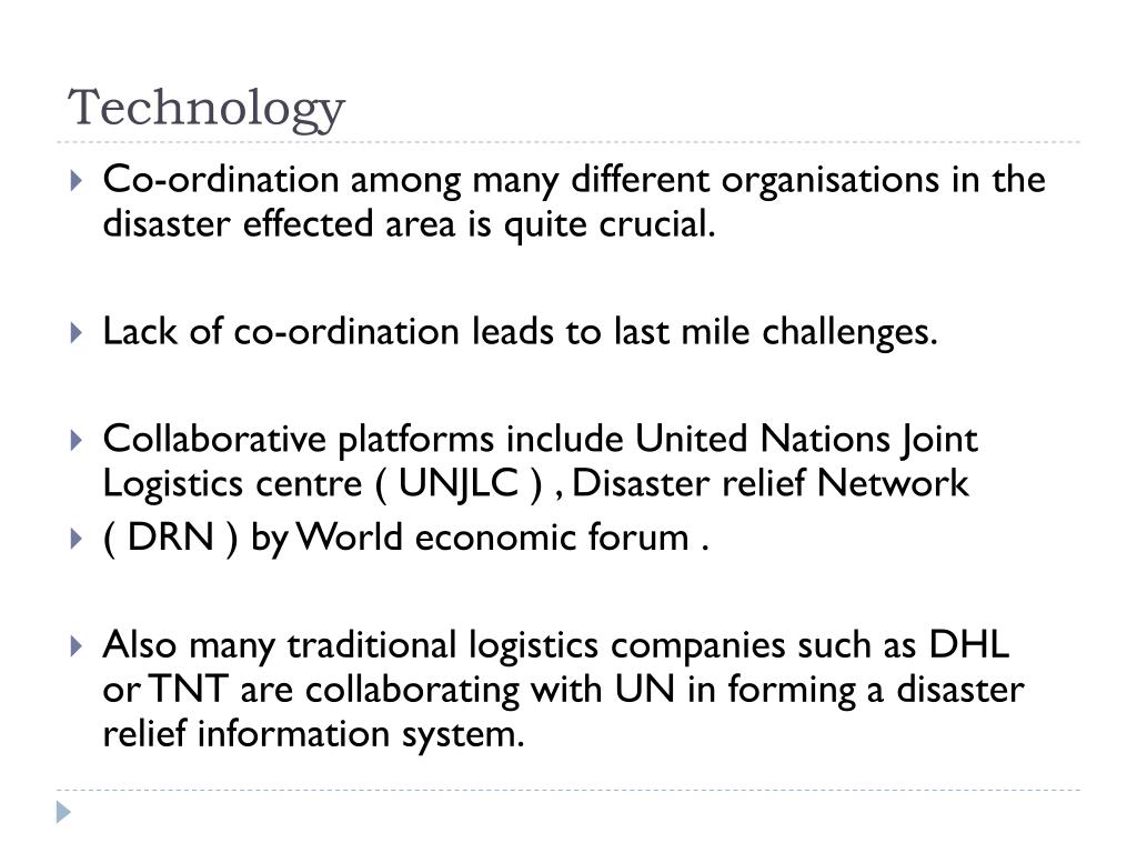 Technology • Co-ordination among many different organisations in the disaster effected area is quite crucial. • Lack of co-ordination leads to last mile challenges. • Collaborative platforms include United Nations Joint Logistics centre ( UNJLC ) , Disaster relief Network • ( DRN ) by World economic forum . • Also many traditional logistics companies such as DHL or TNT are collaborating with UN in forming a disaster relief information system.