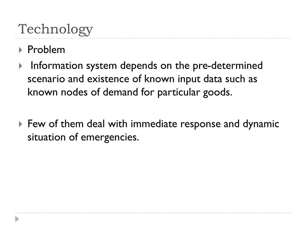 Technology • Problem • Information system depends on the pre-determined scenario and existence of known input data such as known nodes of demand for particular goods. • Few of them deal with immediate response and dynamic situation of emergencies.