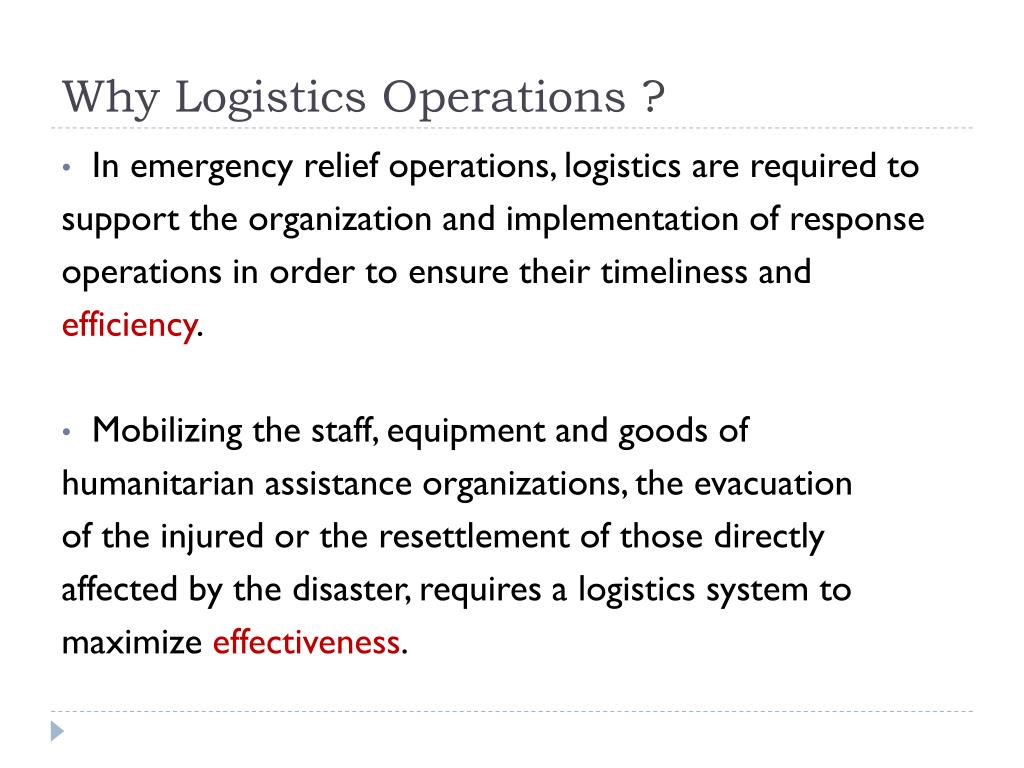 Why Logistics Operations ? • In emergency relief operations, logistics are required to support the organization and implementation of response operations in order to ensure their timeliness and efficiency. • Mobilizing the staff, equipment and goods of humanitarian assistance organizations, the evacuation of the injured or the resettlement of those directly affected by the disaster, requires a logistics system to maximize effectiveness.