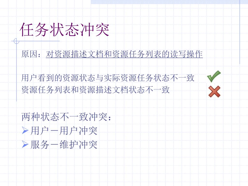 任务状态冲突 原因:对资源描述文档和资源任务列表的读写操作 用户看到的资源状态与实际资源任务状态不一致 资源任务列表和资源描述文档状态不一致 两种状态不一致冲突: • 用户-用户冲突 • 服务-维护冲突
