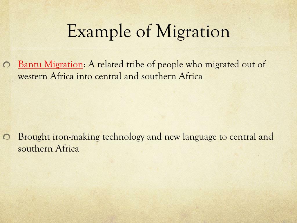 Example of Migration • Bantu Migration: A related tribe of people who migrated out of western Africa into central and southern Africa • Brought iron-making technology and new language to central and southern Africa