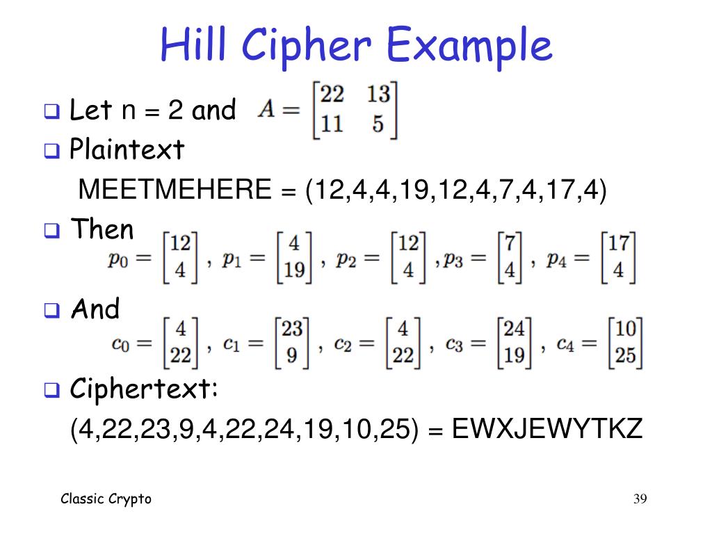 Hill Cipher • Plaintext, p0, p1, p2, … • Each pi is block of n consecutive letters • As a column vector • Let A be n x n invertible matrix, mod 26 • Then ciphertext block ci is given by • ci = Api (mod 26) • Decryption: pi = A–1ci (mod 26) • The matrix A is the key Classic Crypto 38